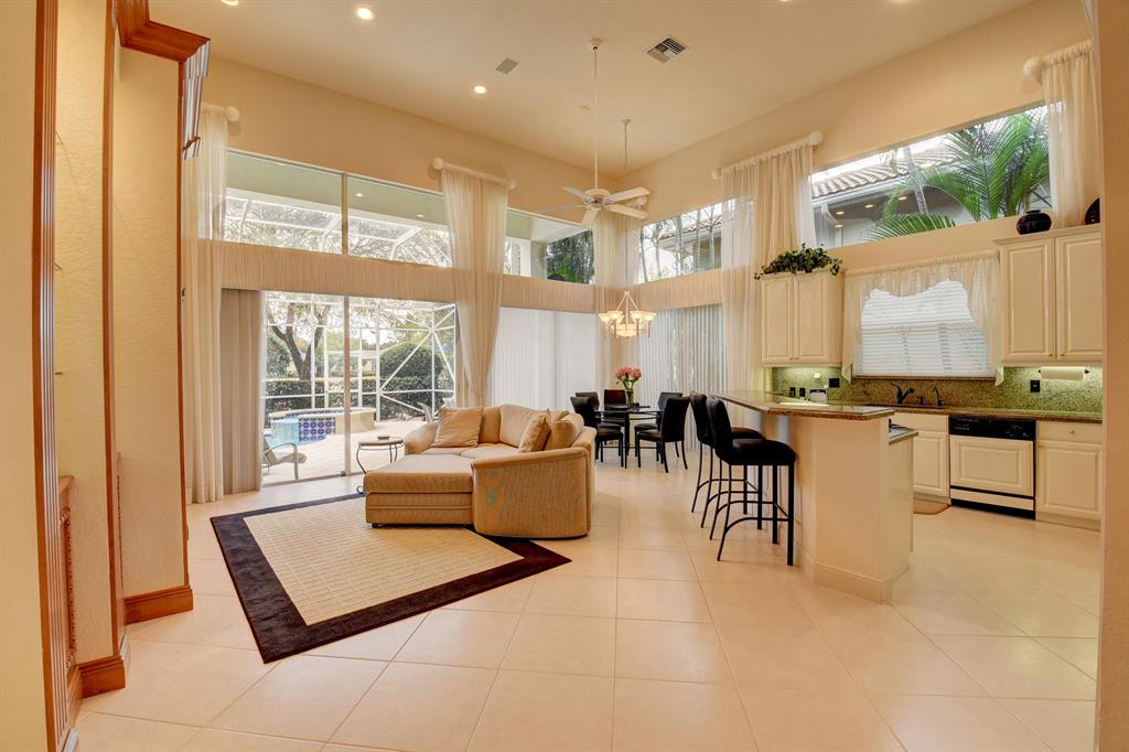 Offering tranquil golf course vistas AND TRANSFERABLE GOLF MEMBERSHIP, this light & immaculate one-story home offering 3 bedrooms & 3 baths features volume ceilings & crown moldings; an open kitchen with 42'' ivory high-gloss cabinetry, granite countertops & backsplash and a charming breakfast nook; built-in Living Room bar; built-in entertainment centers; a spacious Master suite with a marble bathroom; neutral tile & carpeting; faux painted walls; custom window treatments; extra high-hat lighting; solid core molded doors & more. The outdoor area features a screened patio with a heated pool & spa overlooking the golf course. This home is being offered furnished/turnkey.
