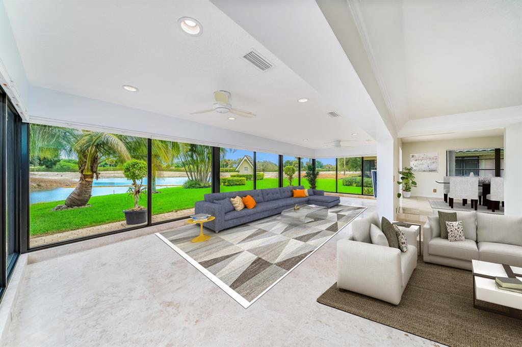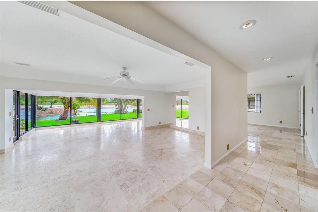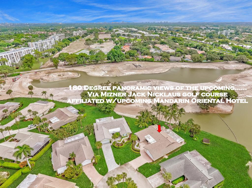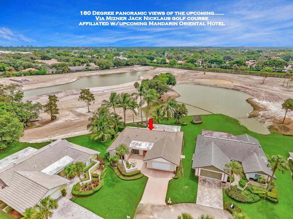 Enjoy magnificent 180 degree panoramic golf & lake views from almost every room in this light & bright, 3 Bedroom, 2.5 bath, 2 car garage home, located on a cul-de-sac on possibly the largest lot in the community (9,654 square feet). Spacious Home is ''Truly'' 2,790 square feet under air. Double door entry to beautiful foyer, opening up to the enormous living room with marble flooring throughout w/south facing scenic views of what will be the 4th hole in the upcoming Via Mizner Jack Nicklaus Signature Golf Course that is affiliated with the Mandarin Oriental hotel. All sliders are Impact Hurricane Glass. Fabulous Kitchen features granite countertops & backsplash, new cabinetry including glass doors for display, updated stainless appliances including Samsung refrigerator w/Flex Zone-4 zone,