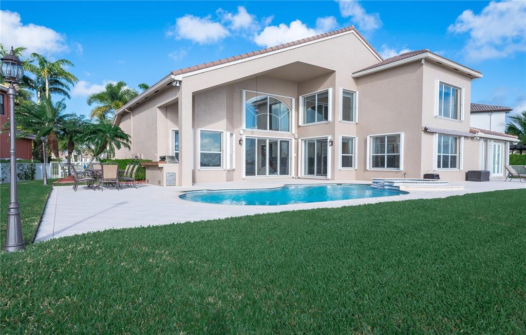 Pristine home in impeccable condition with a spectacular 16,285 SF oversized lot and 120 degree lake views on this cul-de-sac, boasting 5195 SF with 5bed/6baths plus a big loft, 3 master bedrooms, main master bedroom is on the first floor along with another mini suite with its own private bathroom. Porcelain and wood floors. New roof, new 3 H.E. A/C units, new water heater, new S.S. appliances & washer and dryer, accordion shutters, new seawall of 190 feet long. A magnificent addition over 800 SF to the house where you have a Media Room with 1080P Projector,120 inches screen, 7.2 sound system with klipsch speakers, 8 recliner electrical leather seats, full bar w/pool table, wine cooler. Amazing resort-style pool & Jacuzzi.