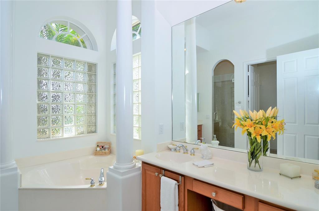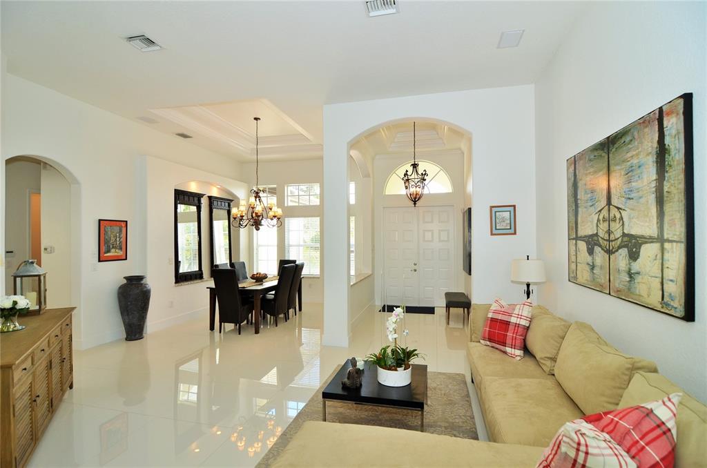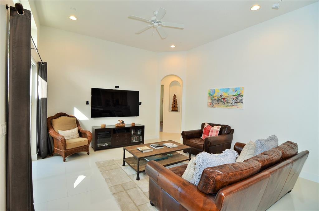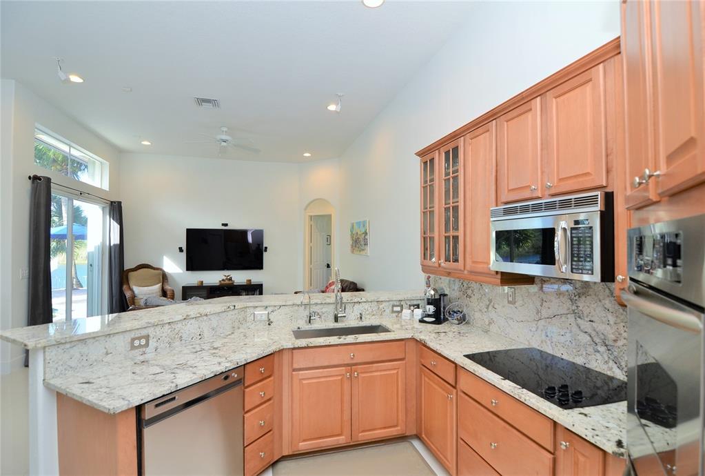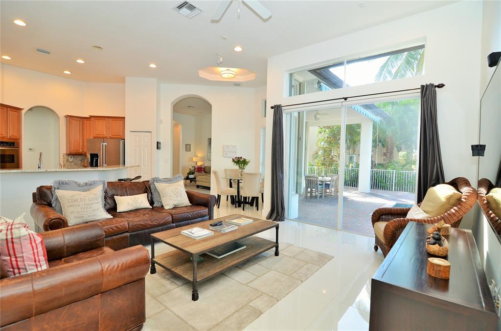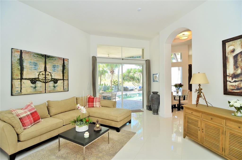 Pristine one-story home in impeccable condition with peaceful waterfront views on this cul-de-sac. Contemporary kitchen with S.S. Kitchenaid appliances, granite countertops and wood cabinetry, newly painted, 32X32 porcelain and wood floors throughout, security cameras, accordion hurricane shutters, Bose surround system, new H.E. A/C units, water heater, Bosch washer & dryer and upgraded bathrooms. Enjoy the beautiful patio with professional landscaping, lighting, new resurfacing pool.