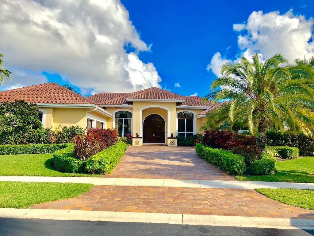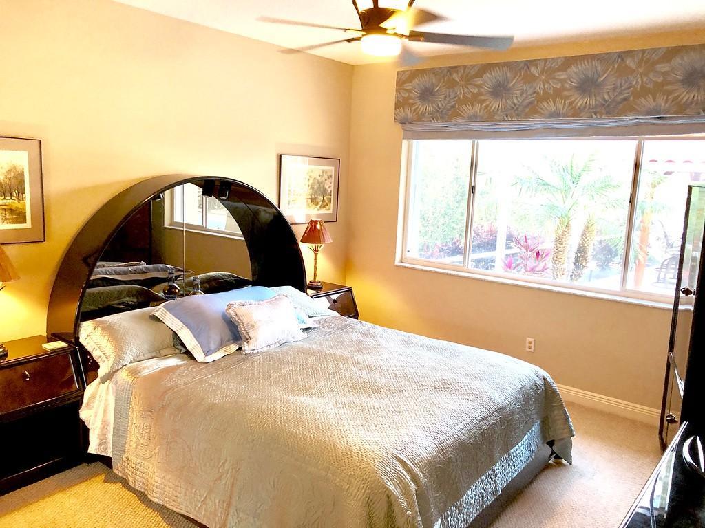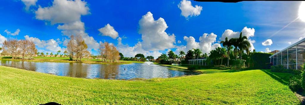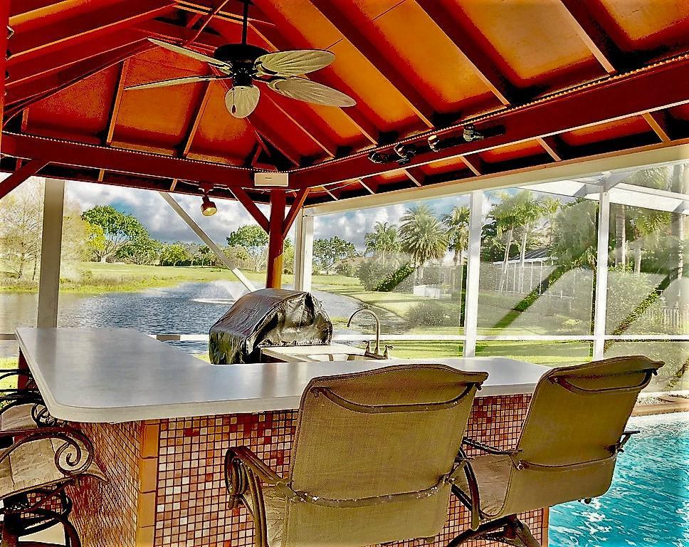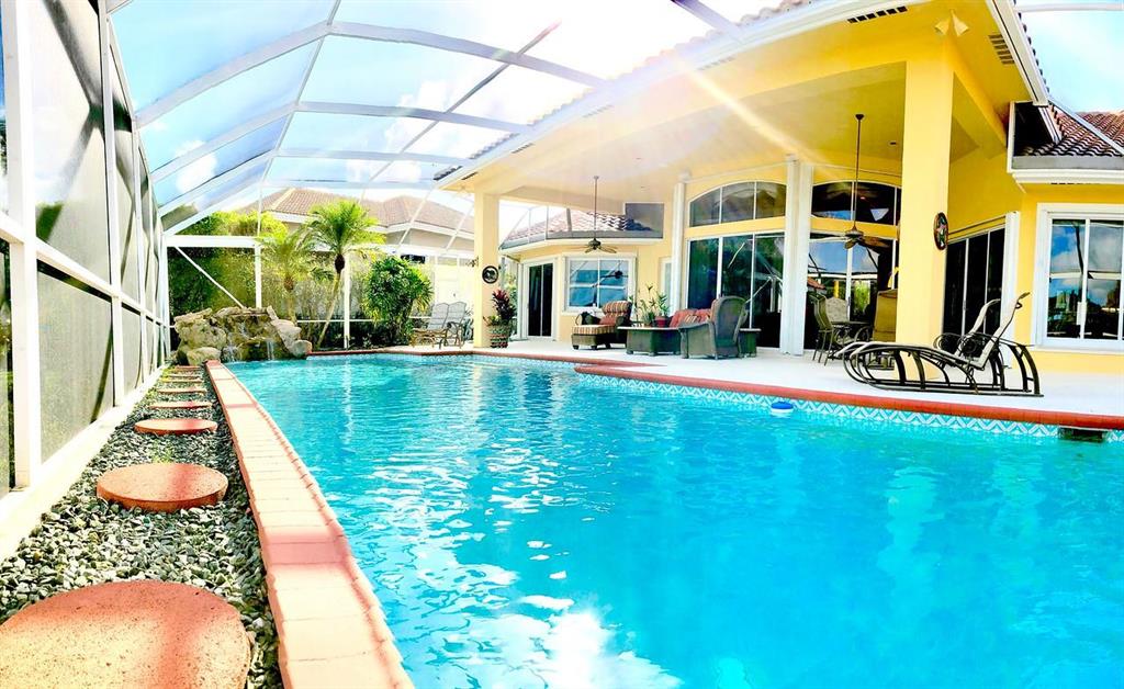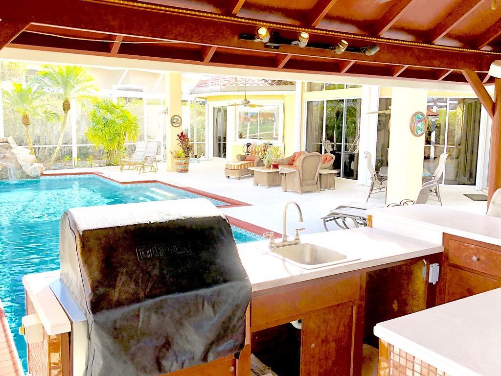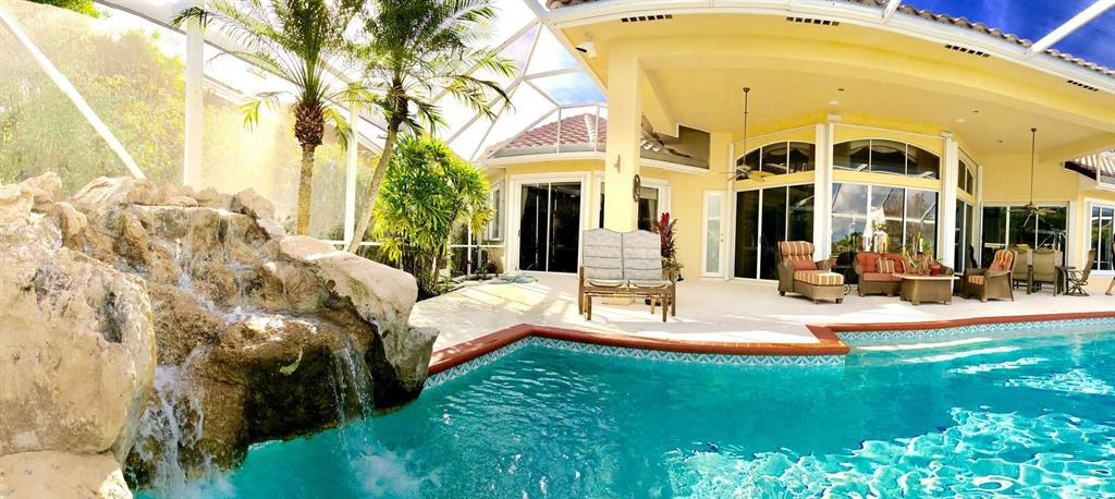 Egret Pointe custom home built on upgraded waterfront lot with expansive views of the lake, and the No.1 and No. 9 holes of the Legend course. Private, no cart path. NEW ROOF FEB.2018. The home has 3 bedrooms w/ bathrooms en suite, 4 renovated bathrooms and cabana bath with hurricane rated back door to pool . One level only,renovated and updated with the finestmaterials. Mahogany hurricane rated door as seen in Architectural Digest, accordion shutters,and hurricane rated garage doors. 3 car garagewith custom built cabinets. Convertible bedroom with built-in Murphy bed & office cabinets. Kitchen with all upscale gas and electric stainlesssteel appliances. Irrigation water from lake. Back deck with heated lap size pool, rock waterfall, covered bar and grill area.