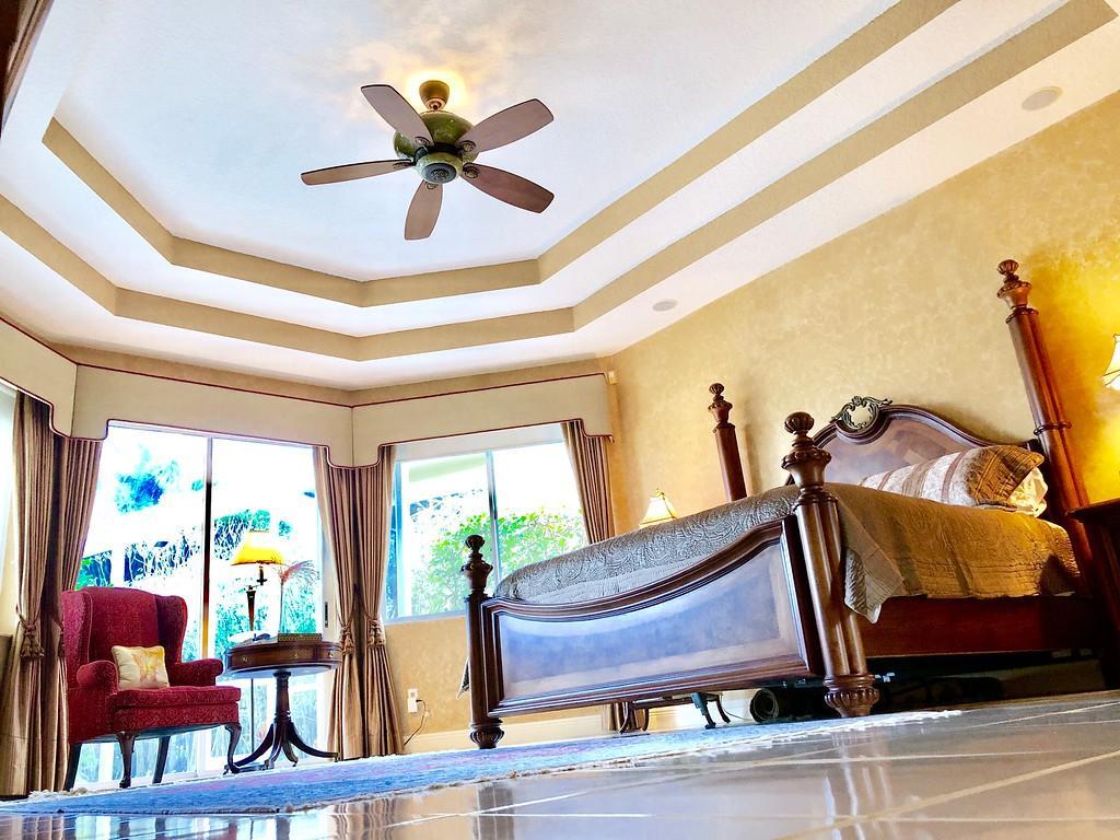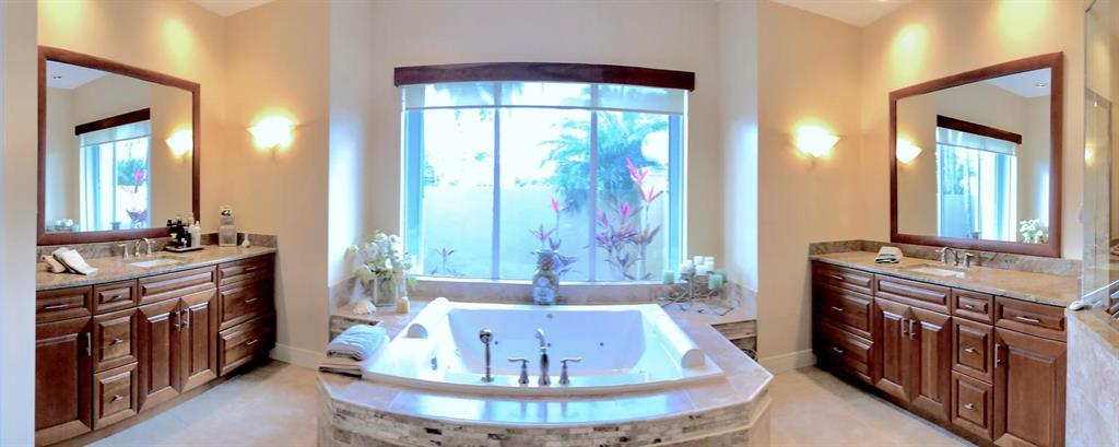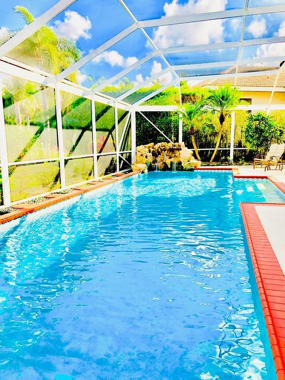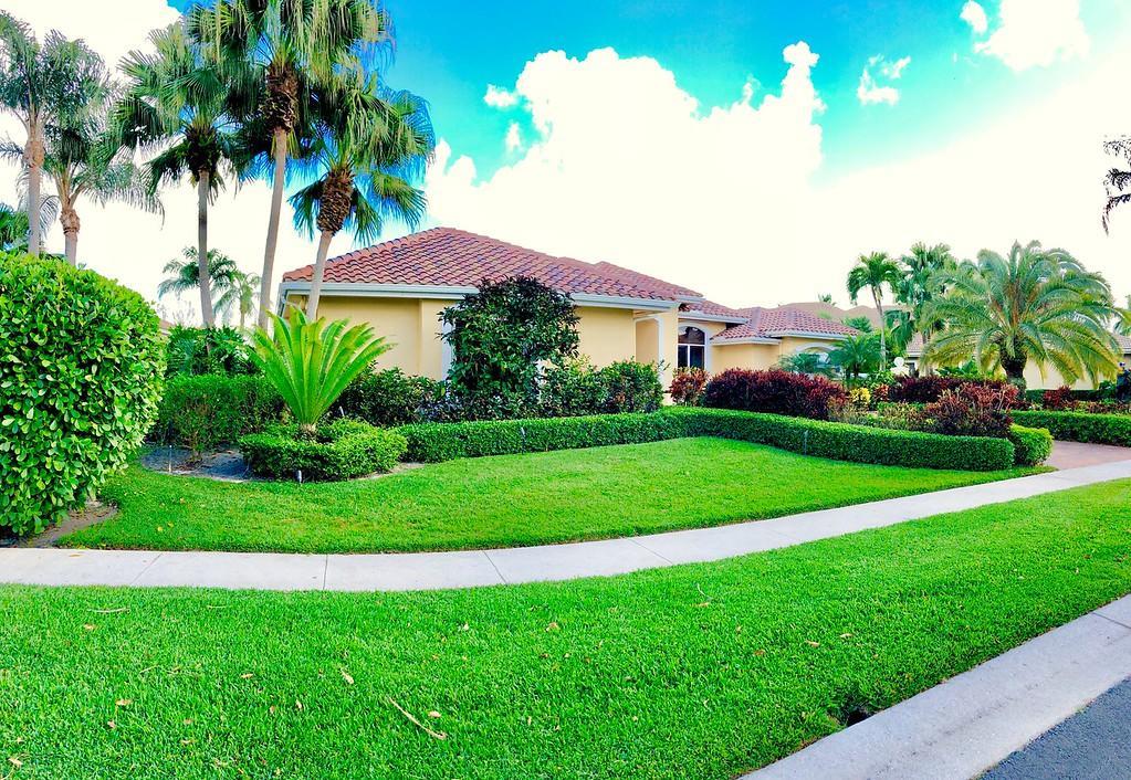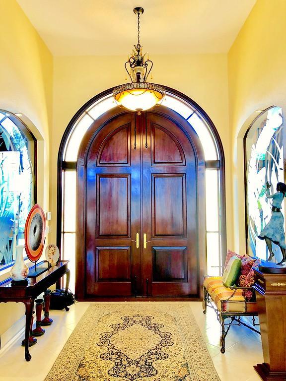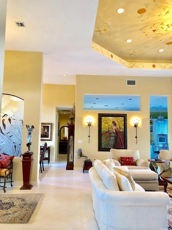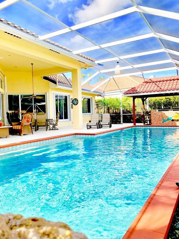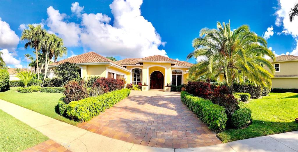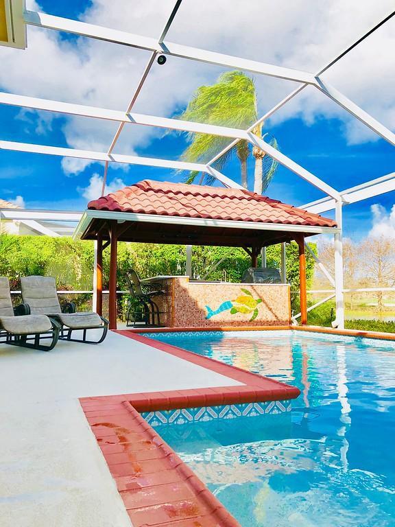 Egret Pointe custom home built on upgraded waterfront lot with expansive views of the lake, and the No.1 and No. 9 holes of the Legend course. Private, no cart path. NEW ROOF FEB.2018. The home has 3 bedrooms w/ bathrooms en suite, 4 renovated bathrooms and cabana bath with hurricane rated back door to pool . One level only,renovated and updated with the finestmaterials. Mahogany hurricane rated door as seen in Architectural Digest, accordion shutters,and hurricane rated garage doors. 3 car garagewith custom built cabinets. Convertible bedroom with built-in Murphy bed & office cabinets. Kitchen with all upscale gas and electric stainlesssteel appliances. Irrigation water from lake. Back deck with heated lap size pool, rock waterfall, covered bar and grill area.