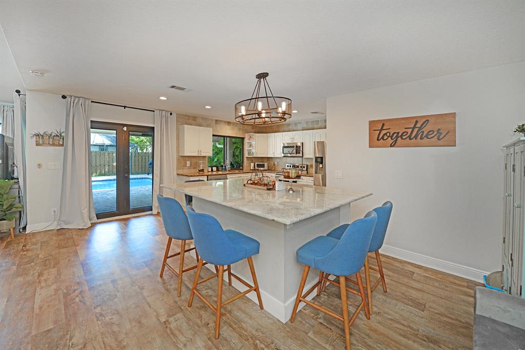 Stunning recently renovated home with open floor plan .Entire house has IMPACT GLASS AND DOORS. Gourmet kitchen with Stainless Appliances and a spectacular island with tons of storage. New floors and custom fixtures. Tropical backyard with newer deck, sitting area and pool. Newer A/C with Nest thermostat. 2 car garage is converted into storage room. This house is priced to SELL! A rated schools.