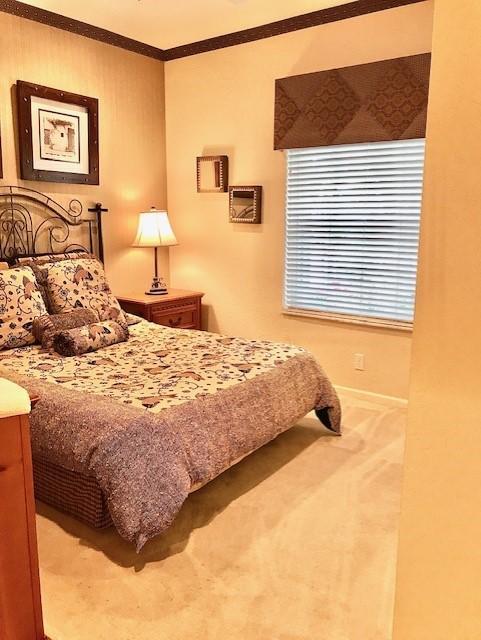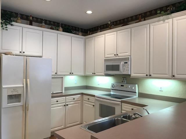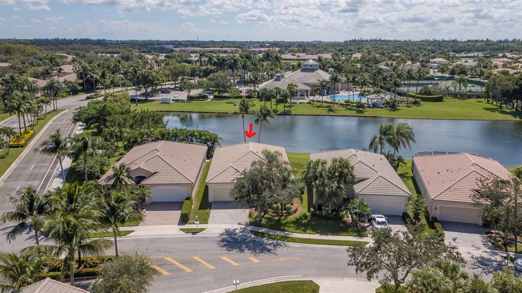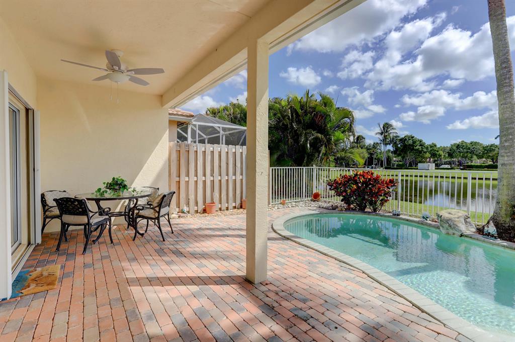 Beautiful home formally the builders' model home! Wood-like tiled floors set in a herringbone pattern greets you at the front door and travels throughout. Carpeting in the two bedrooms. The third bedroom is being used as a den/office. 42'' white kitchen cabinets, undermount lighting and crown molding on top. Family and formal living rooms are separated by an open shelving partition. Master bathroom has dual sinks, and dual shower heads in the shower and separate soaking tub. Linen closets in both bathrooms. Complete accordion shutters, kidney shaped pool over looking lake all fenced in. Covered patio for outdoor dining come rain or shine. Lawn maintenance and a great cable package and internet covered in the HOA. GUARD GATED community -