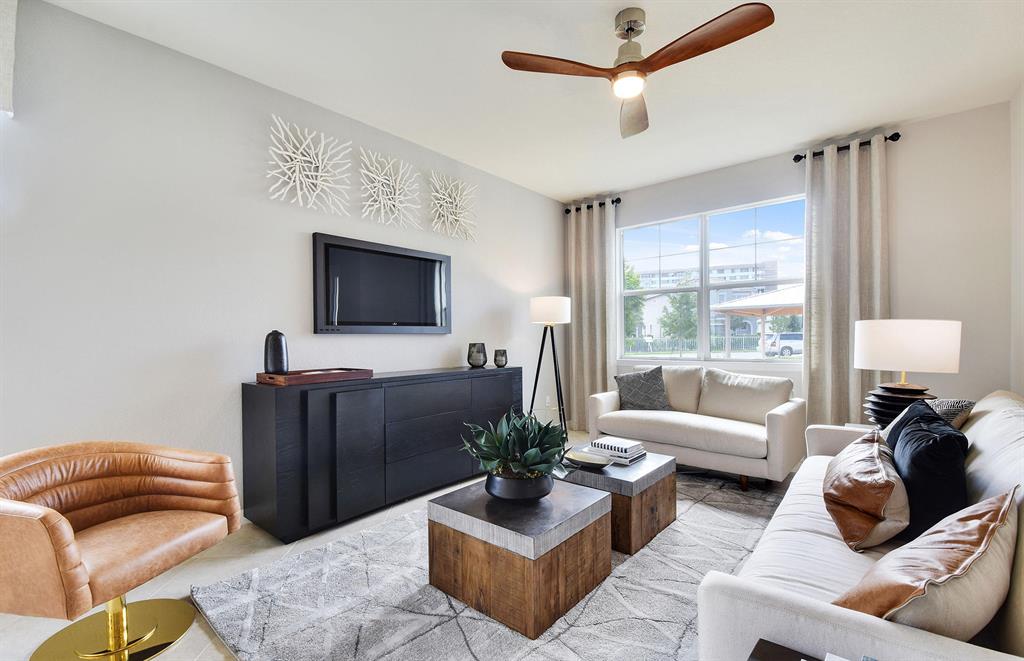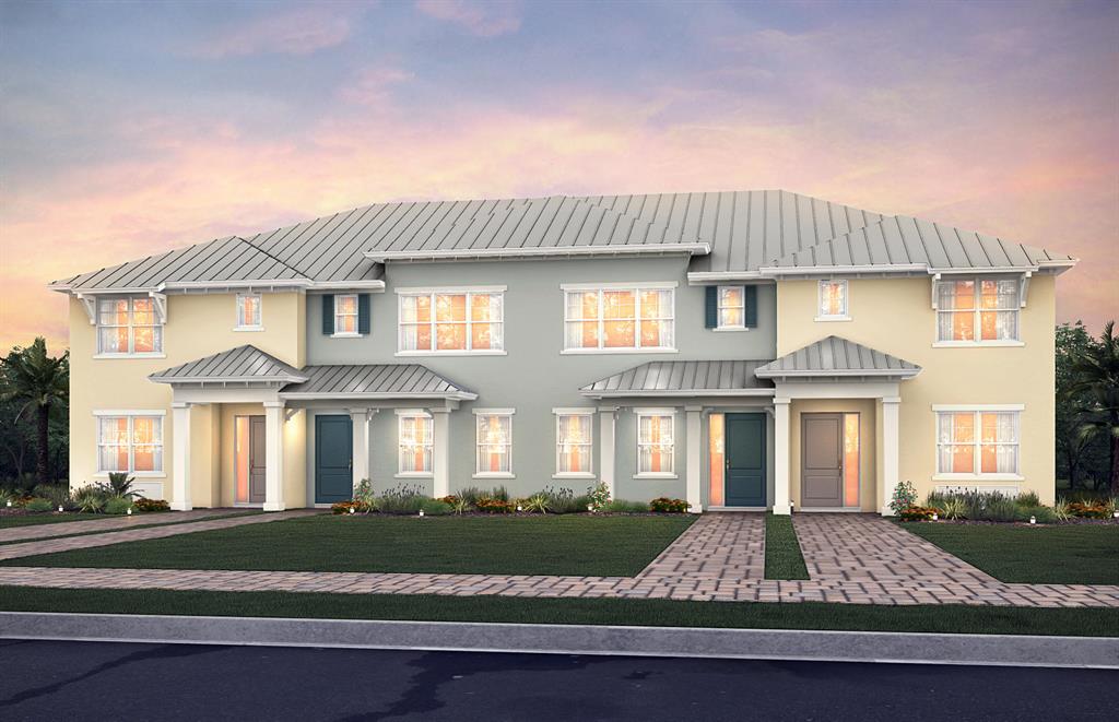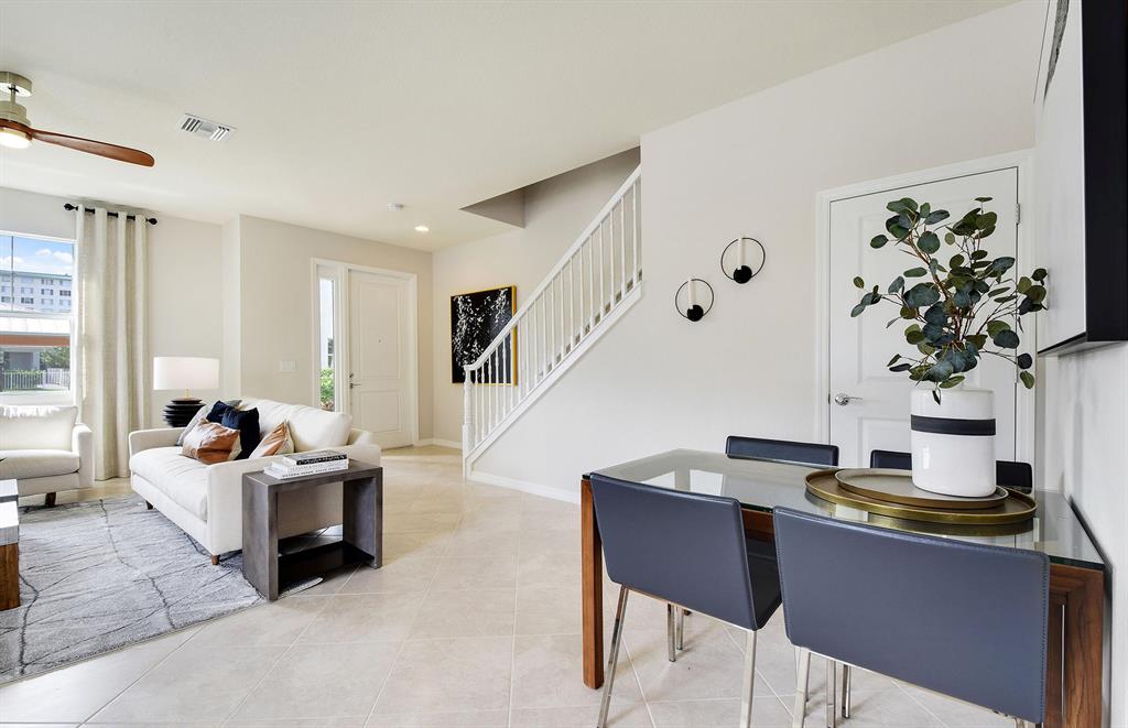 The two-story Magnolia Interior plan boasts an open-concept gathering room area and a rear load one car garage that opens to the kitchen for ease of access. This Magnolia Interior home is available for quick move-in. This one-car garage townhome features impact glass throughout, Grey Expo countertops in the kitchen, Brellin Deco Laminate/White cabinets in the kitchen, Drop Tray ceiling in Owner's Bedroom, Utility Room, tile on the first floor, and much more!