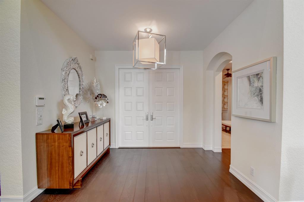 A long driveway leads to this remodeled 2-story home of 5 BDs + loft & 5 BAs of contemporary flair. Features include volume ceilings with crown moldings, energy-efficient high-hats & speakers; custom window treatments;dark engineered wood floors & neutral carpet; impact glass rear sliding glass doors.The gourmet island kitchen offers white 42'' cabinets by Christopher Peacock with self-closing drawers & roll-outs;marble counters & backsplash & top-of-the-line appliances. The Master Suite on the first floor offers custom closet design & an upgraded bathroom of marble counters & a steam shower with rain head. All secondary baths have been remodeled. The laundry room has upgraded cabinets, counters & newer washer & dryer. The inviting private back has a covered lanai & open patio with a pool.