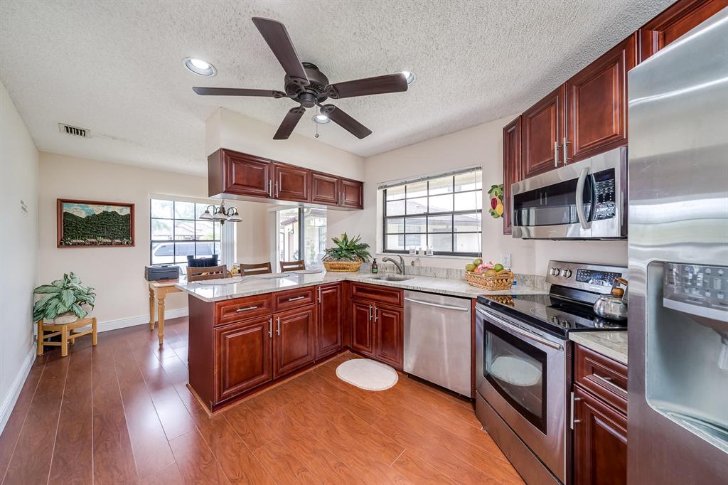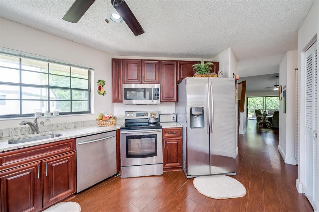 Location, location, location! Renovated 3 Bedroom & 1CG Corner Unit Townhouse in Central Boca! 24/7 Guard Gated community. Bright, open & airy with vaulted ceilings, upgraded light fixtures, remote controlled ceiling fans & Wood flooring thru-out. Granite kitchen with self-close cabinetry & Stainless Appliances. Master suite is located on the 1st floor and boasts oversized closets. All Updated Bathrooms! Newer Roof & A/C! Hurricane shutters. Oversized screened patio overlooking huge private backyard! You won't believe how spacious this townhouse is! The gated community features a beautiful entrance with recently repaved roads, community pool, & tennis court and is located within walking distance from major shopping centers, places of worship, a public library and community centers! The HOA