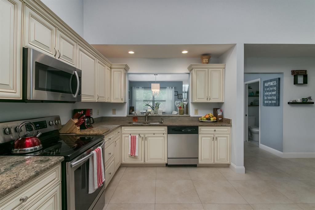 Move-In Ready and wonderfully maintained corner unit featuring 3 bedrooms and 2 1/2 bathrooms. Vaulted ceilings and beautiful flooring throughout. ROOF DONE IN 2017, IMPACT WINDOWS. TANKLESS WATER HEATER, SMART THERMOSTAT, UPGRADED BATHROOMS, GRANITE COUNTERS, STAINLESS STEEL APPLIANCES. Spacious Master Bedroom. HOA fee includes water, insurance, the gate, community pool and guesthouse, plus your landscaping too!