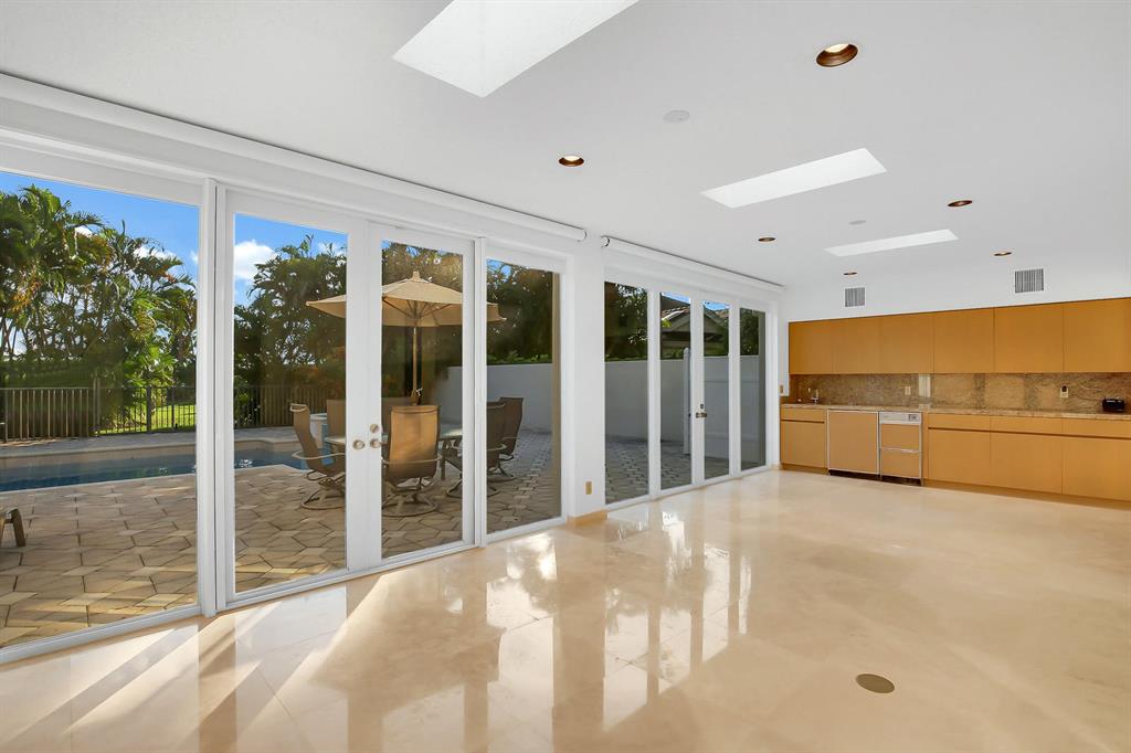 Desirable Boca West Country Club where all memberships are available. Serious seller has priced this beautiful, expanded home on the golf course to sell now! Very open, contemporary & full of natural light with dramatically high ceilings, skylights, 24'' marble floors, heated pool w/spa + oversized pavered patio. French doors across the entire back of home lead out to pool/patio. Coveted Southern exposure in the back for perfect sun on the pool. In addition to the spacious Master Suite w/luxurious bathroom, there are 2 additional TRUE bedrooms each with their own ensuite bath. There's another full bathroom w/pool access plus an elegant powder room w/pretty onyx counter. Formal dining room w/built-in buffet is fantastic for entertaining. Family room off kitchen has custom built-ins.
