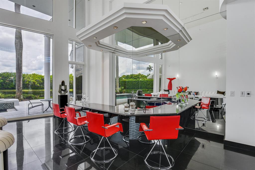 This timeless contemporary has sensational lake and sunset views. A circular driveway services a three plus car garage and main entry, while a two story entry foyer, with sweeping staircase, transcends to a granite accented great room, dining area, and entertainment bar, with direct views of the open pool, patio and lake view. An exceptionally spacious first floor master bedroom suite with dual baths and closets opens to the pool patio with lake views. An updated contemporary kitchen, breakfast area, full family/media area, elevator, office with full bath and an additional bedroom suite complete the first floor. The second floor, serviced by staircase or elevator, features a media room, billiards/game room and four additional bedroom suites and two balconies. Membership is required.