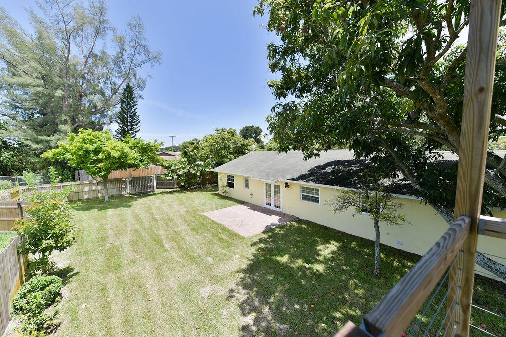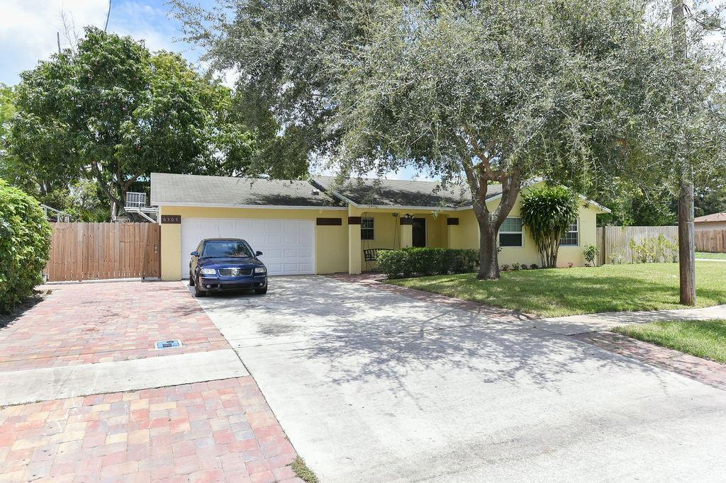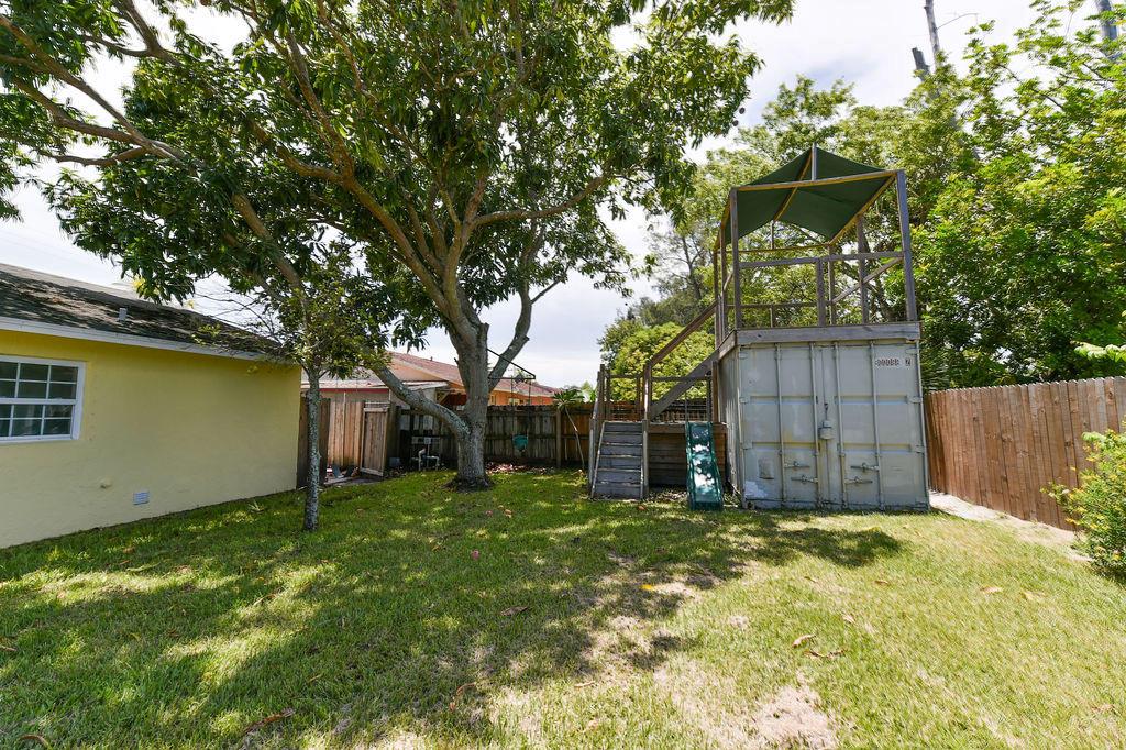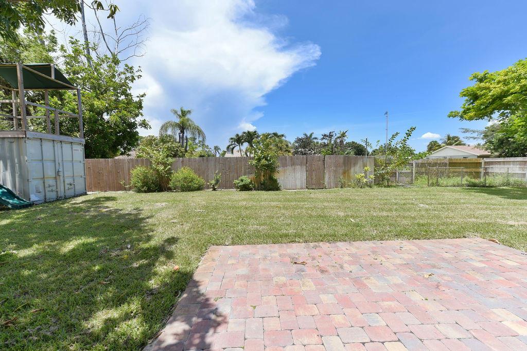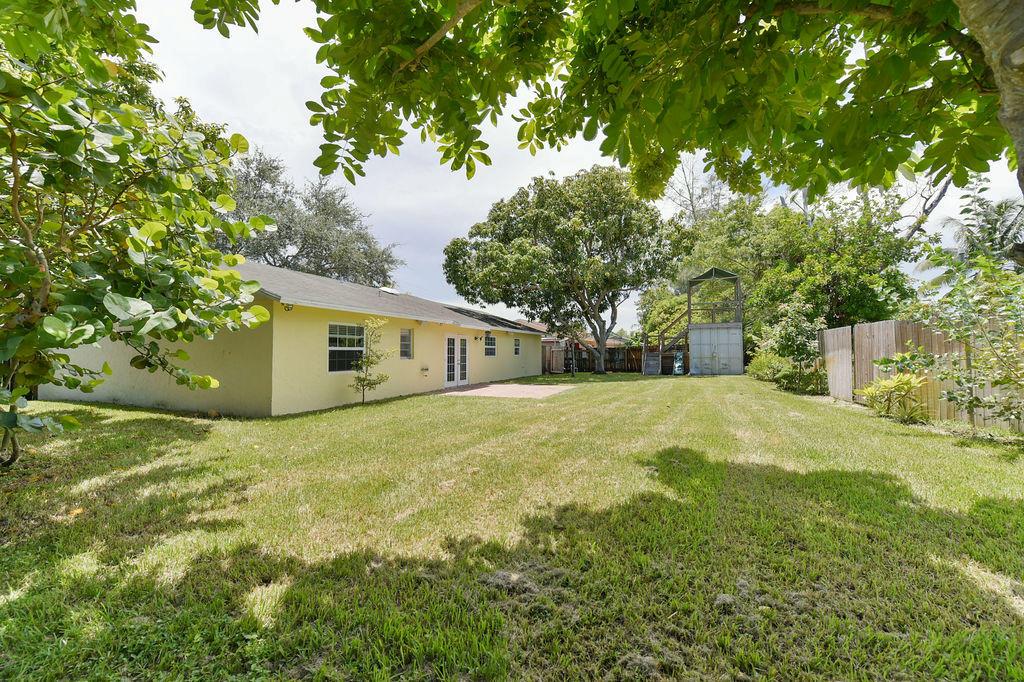 Incredible 3/2 CBS home with bonus features: large corner lot, granite countertops in stylish kitchen with stainless steel appliances, freshly painted home interior and exterior, dark laminate wood floors, bonus room/office with adjustable butcher's block desk, extra paver driveway and side gated parking areas, front door peephole camera with built-in screen along with 10 security cameras and screen, viewable on Apple or Android with free app. White French doors open to gorgeous fenced back yard with paver patio and lots of fruit trees- mango, coconut, ackee, avocado, starfruit and many more. Small fenced area for gardening. Property includes well for landscaping and sprinkler system to keep your yard lush and green year round. 3 backyard vehicle gates with deadbolt locks.