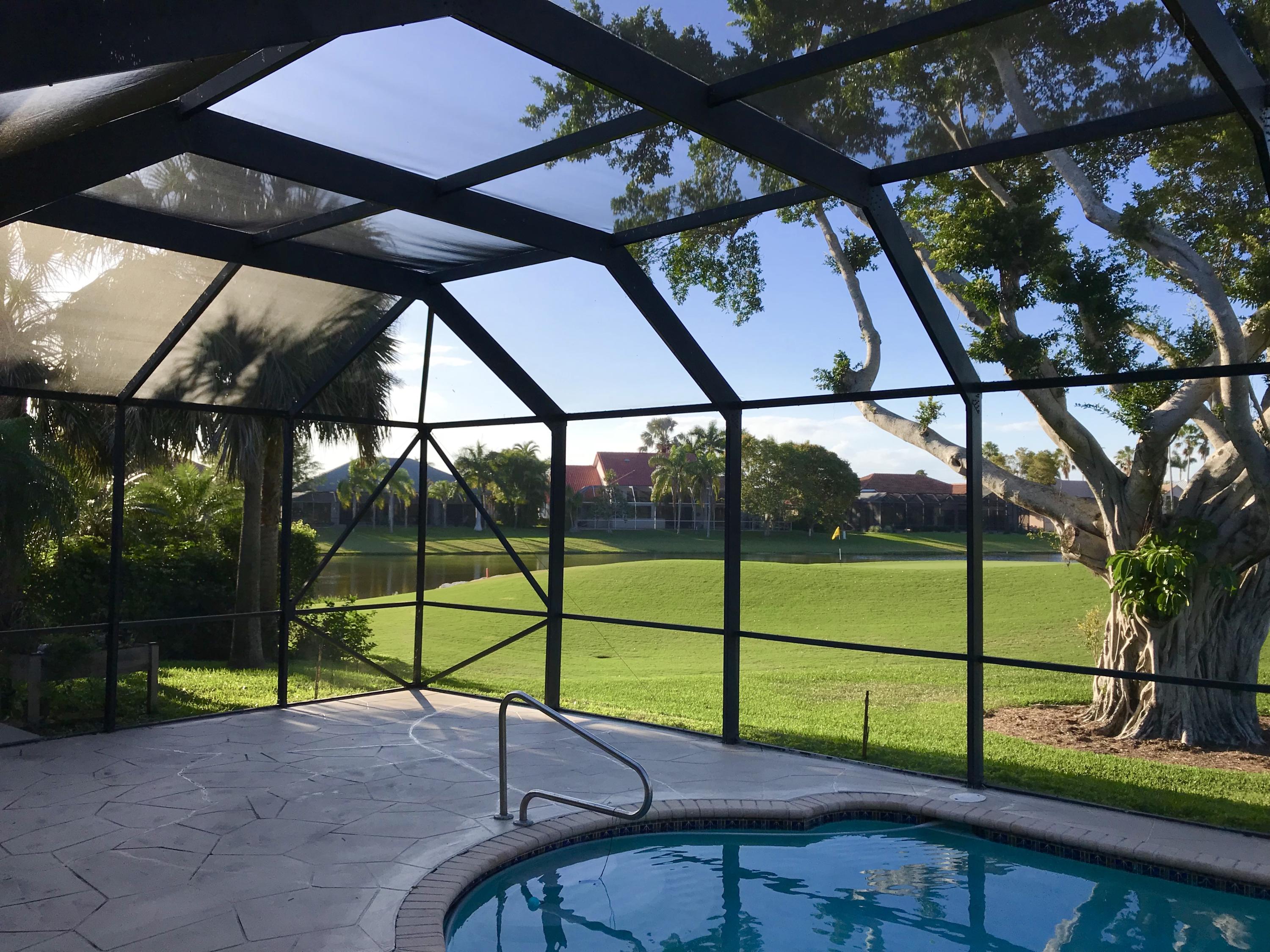 Bright renovated home located on stunning premium golf course lot overlooking two lakes in Stonebridge Country Club. 3 bedrooms + Office or convertible 4th bedroom, 3.5 Bathrooms. New kitchen, porcelain floors, and roof installed in 2016. High flat ceilings that have had popcorn removed in all bedrooms/ hallways. Designer lighting throughout. Fabulous master suite with two large walk in closets. Split floor plan. New landscaping. Hurricane shutters. 2 car + golf cart, air conditioned garage. Freshly painted inside and out. Many upgrades throughout. All furniture available separately. MEMBERSHIP AND EQUITY REQUIRED.