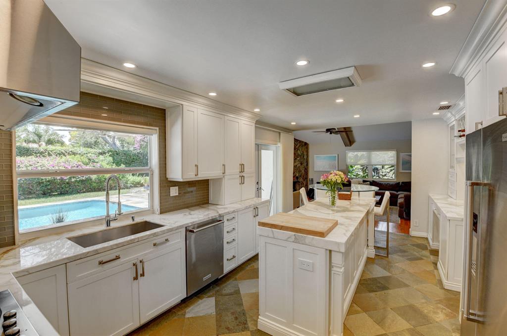 Exceptional! Updated coastal modern Estancia beauty all on one level with exquisite high-end designer perfect appointments is sure to impress! This 4 bedroom 4 bath home is on an oversized lot backing to community park with playground, basketball & tennis courts. Magnificent white kitchen features marble counter-tops and top of the line appliances. Master suite includes french doors to pool, custom his/hers closets, fully renovated his/her baths. Main living areas have wood floors. Also featuring decorative and porcelain tile in baths, impact glass, new recessed lighting, outfitted closets throughout, custom built-ins, working fireplace, and wood beams. Zen backyard has updated pool and deck lighted pergola and redone pool. New A/Cs! A rated schools!