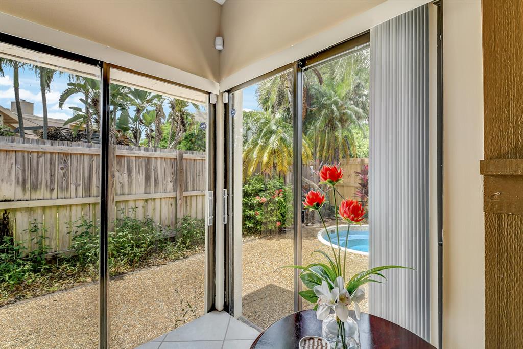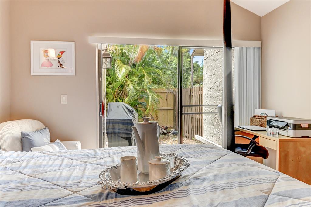 Centrally located in Boca Raton,one story Villa/Townhome w/vaulted ceilings (no popcorn) & open floor plan. Walk in through your own gated private courtyard w/spa. Featuring 3 bedrooms, 2 updated bathrooms & 1 car garage. Updated huge kitchen with stainless appliances, granite counter tops, new cabinets with tons of storage, wine fridge, a convenient window pass through that has access to the patio/sliders from kitchen as well. The living room is open and features high ceilings, a fireplace, tons of light from all the windows/sliders, a sky light and French doors. The living area features tile flooring on a diagonal and the bedrooms feature laminate flooring. Huge master bedroom with walk-in closet, patio off the master, Master bath with dual sinks. Large private patio that backs up
