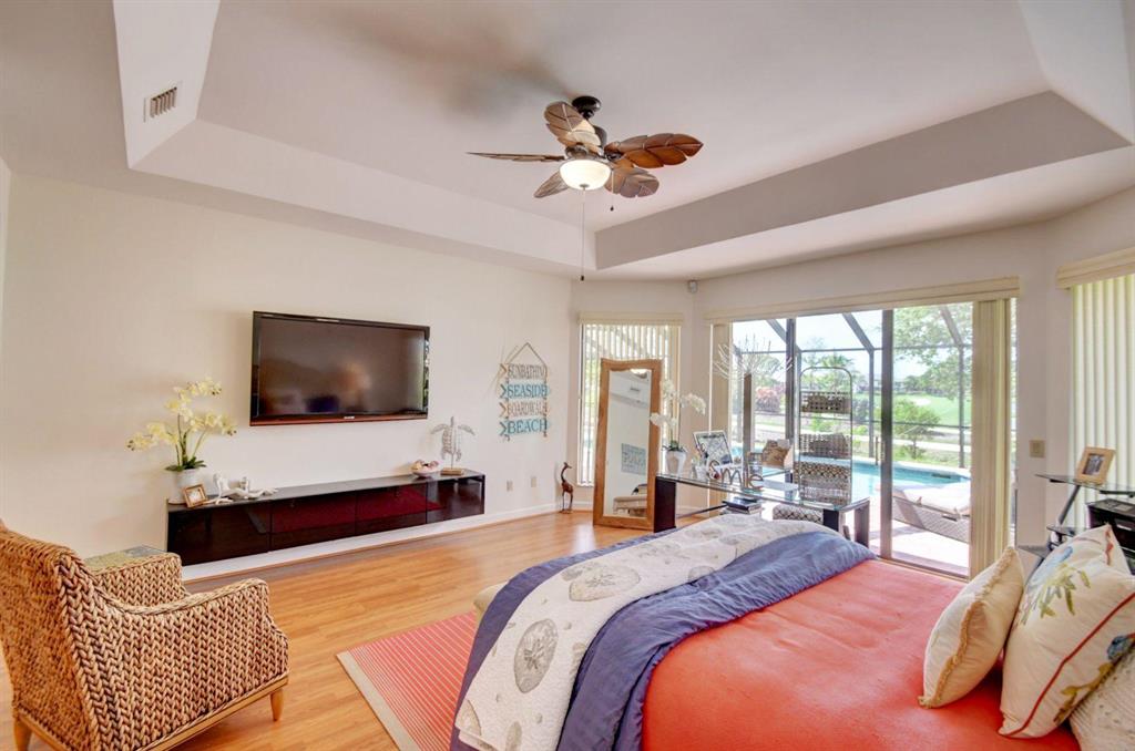 Beautiful meticulously maintained home featuring 4 bedrooms and 3.5 baths situated on a premium lake lot. This home features great open floor plan with gourmet kitchen, island, and large eat in breakfast area. Great screened in outdoor pool space with built-in granite BBQ & bar perfect for entertaining. lushly landscaped lot is set-back and buffered for complete privacy. 2 car + golf cart garage. Roof replaced in 2008.
