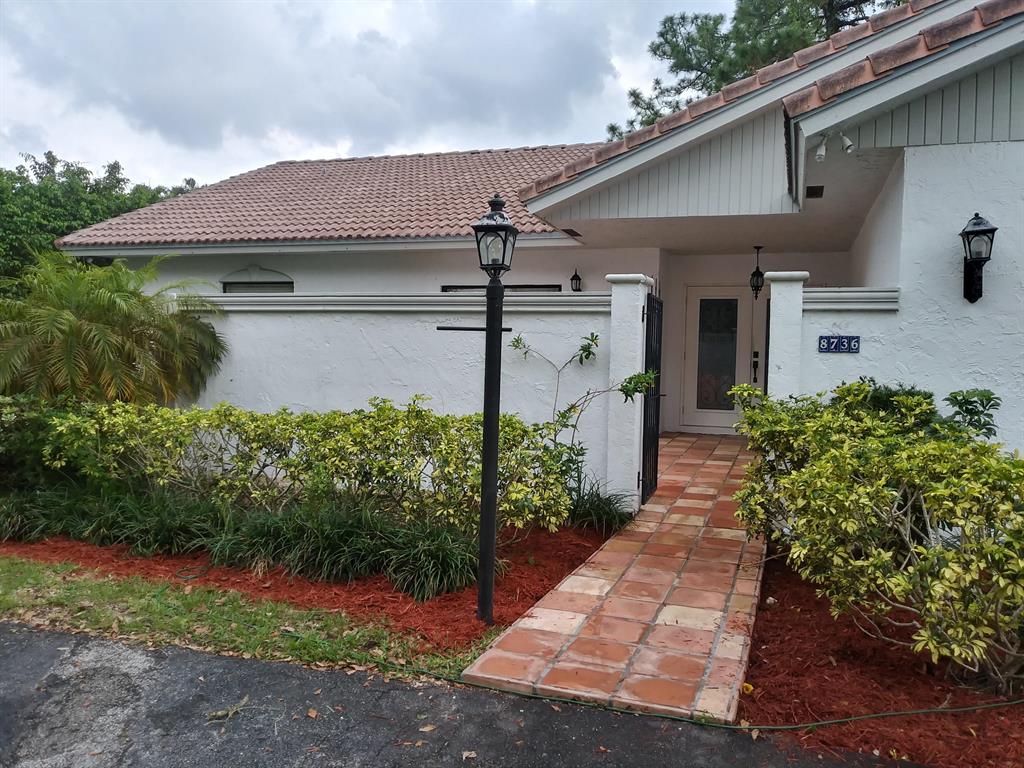 Location, location, location. Only $125 a month HOA in a Beautiful Gated Community of Single Family Homes w/Shady Tree-Lined Streets & Park on Interior Lake...Close to the Florida Turnpike, I-95, Restaurants and Shopping. This stunning home is a single story with circular driveway, big front porch, Double Glass and iron front doors, beautiful glossy Rectified Porcelain Flooring and 16 Ft Wood Planked Vaulted Ceiling. Updated kitchen and bathrooms, huge updated master shower, sliding doors everywhere and beautiful Travertine pavers on the back patio, all this on a (80' X 105' approx) Beautifully Landscaped Lot. SPRINKLER IRRIGATION, WINE COOLER