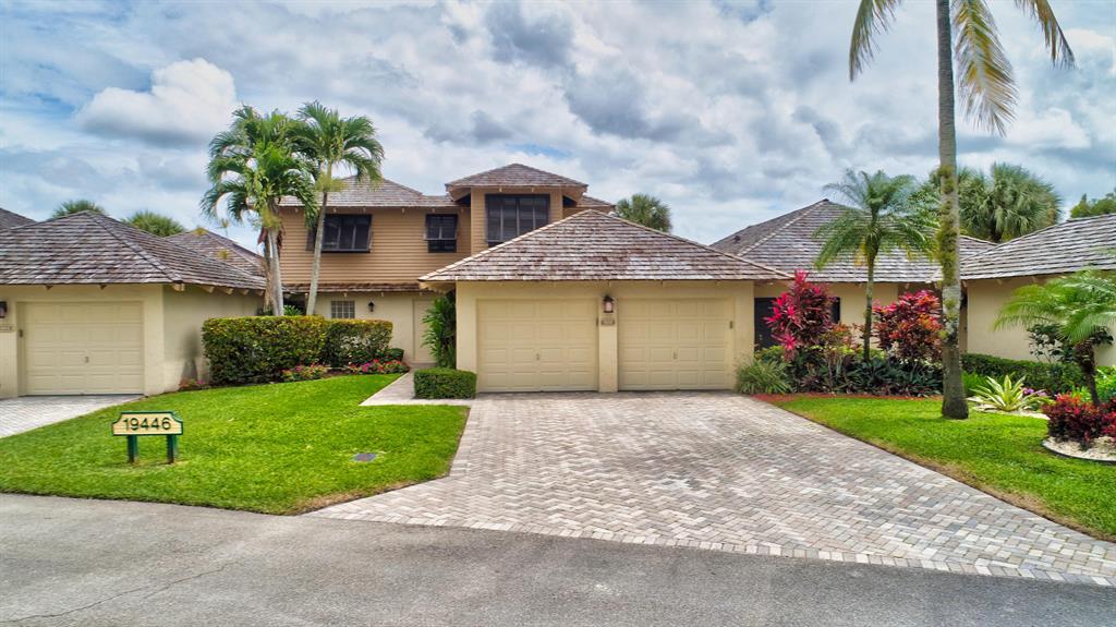 Gorgeous view of water and golf!Beautifully maintained home featuring new roof, hurricane doors and windows. New kitchen . Large living room and den overlooking water and golf.Gracious Master bedroom on main level with 2 guest bedrooms on upper floor.Home is across from pool.Mandatory Boca West Country Club membership.