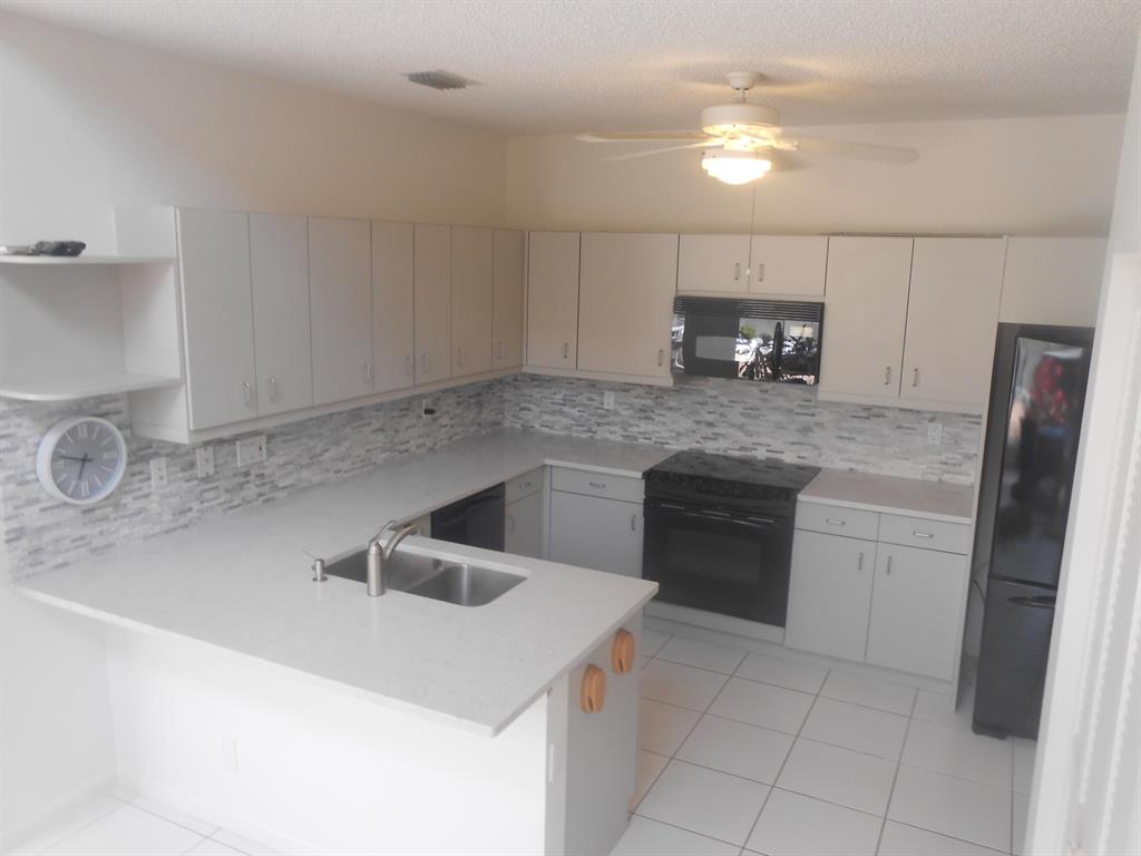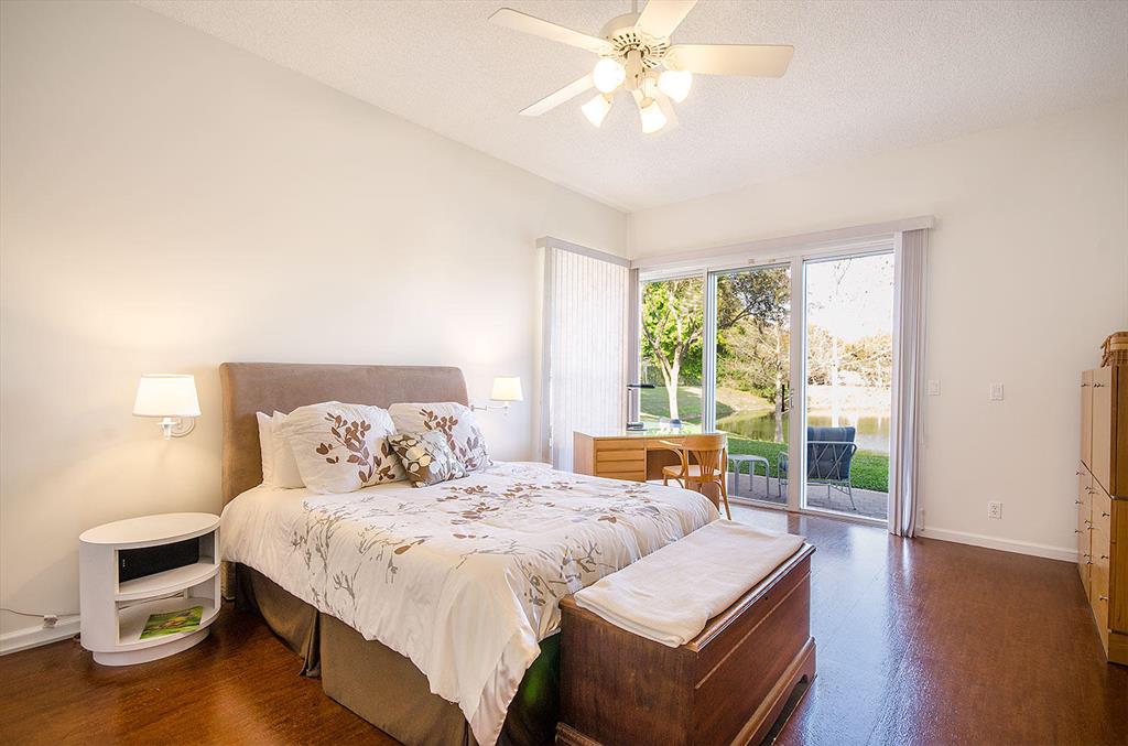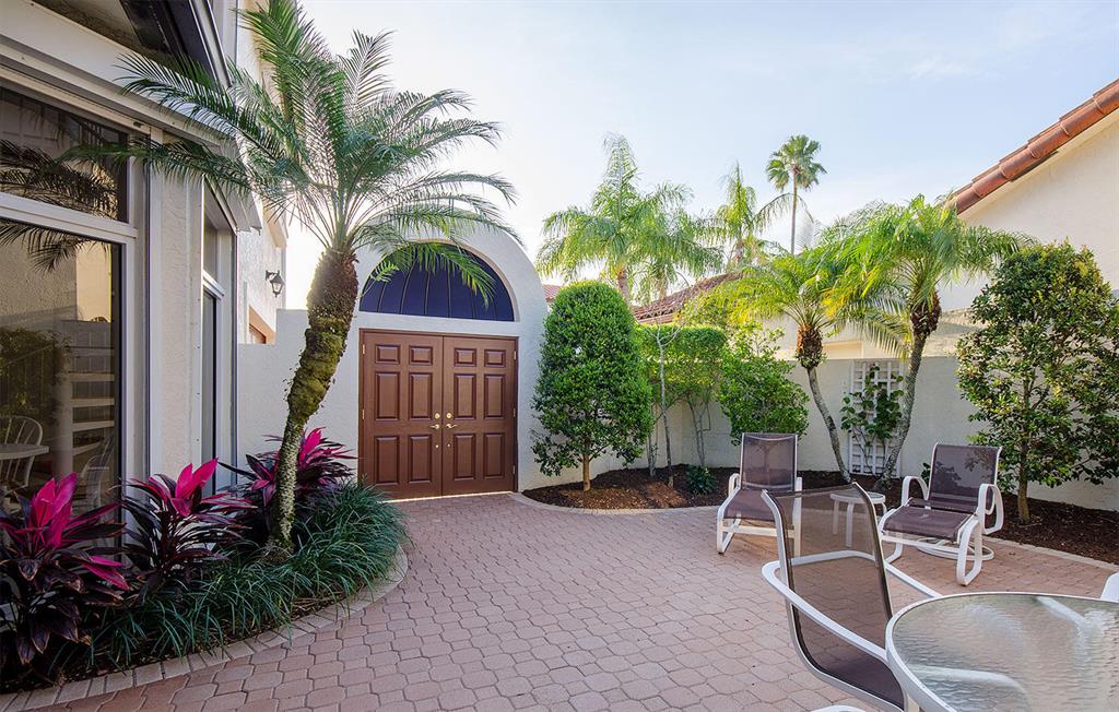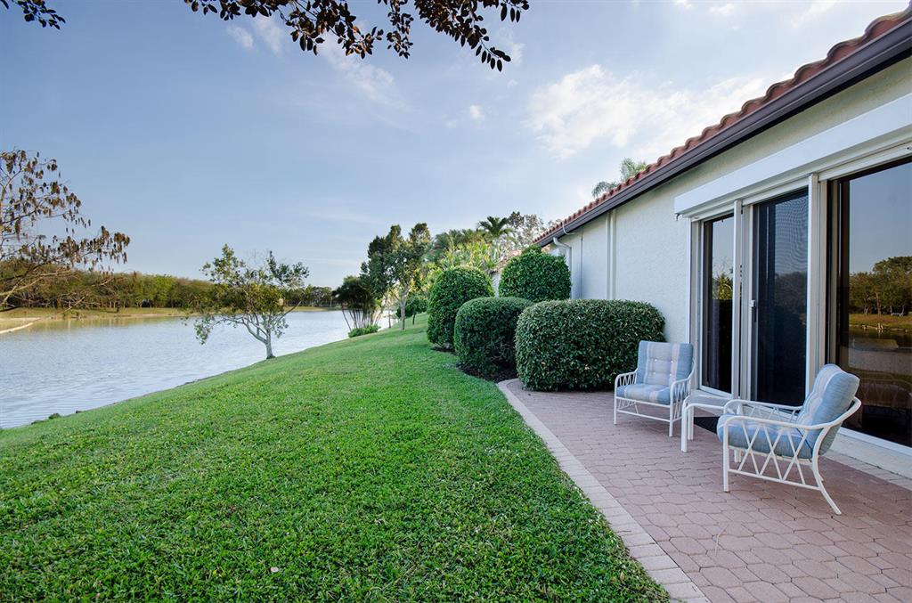 Beautiful maintained courtyard home in exclusive guard-gated Boca Pointe. Spacious and private, this sanctuary features dual master bedrooms, one upstairs and one downstairs, each with walk-in closet and private bathroom. Bonus storage/hobby room! Vaulted ceilings with floor to ceiling windows, upgraded open kitchen & living areas to a private tropical courtyard & patio. Back yard faces lake, gentle eastern sun. Full house roll-down shutters, a newer roof and new AC unit. Via Stel (within Boca Pointe) is an intimate circle of 90 homes and has an impeccable community pool area. The low monthly maintenance fee includes lawn care, alarm system monitoring, and cable. Boca Pointe has an OPTIONAL country club program offering flexible memberships for those interested