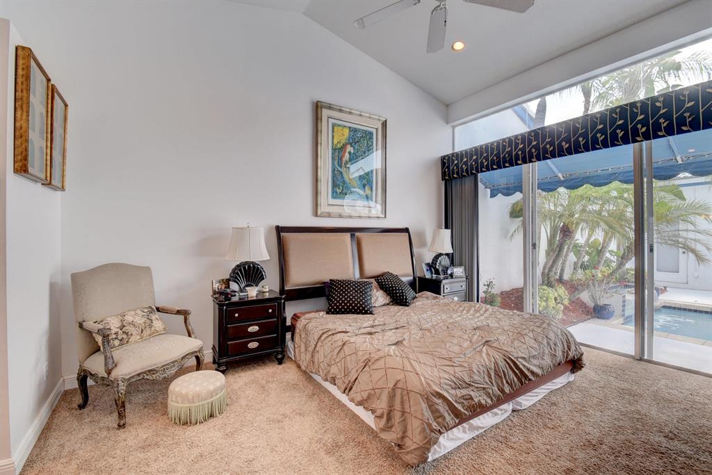 For someone who prefers privacy yet demands a feeling of spaciousness and luxury, Mykonos Court in Boca Country Club is the place. The home has 3 bedrooms and 3.1 baths, and a private courtyard where you can sun beside your pool and fountain. Inside you will find vaulted ceilings and expansive glass windows which combine to give you a feeling of luxurious space. The guest house has 2 bedrooms/den and 2 baths. but is currently furnished as a bedroom and living room. A separate backyard patio overlooks the C15 canal and the Bocaire golf course. This is a pet friendly neighborhood as well.