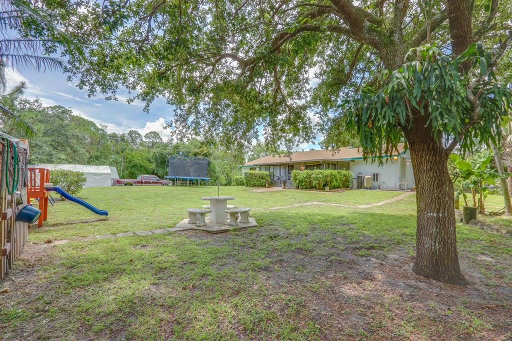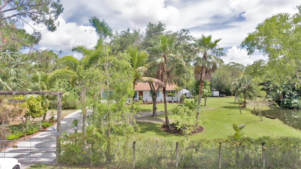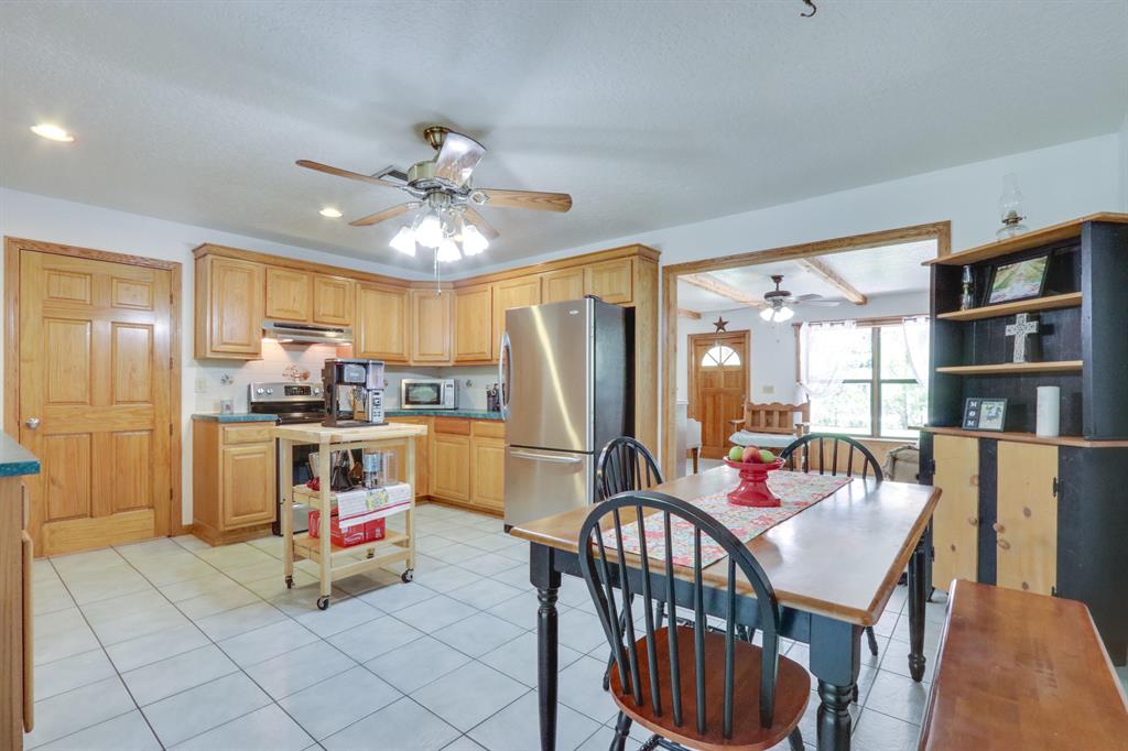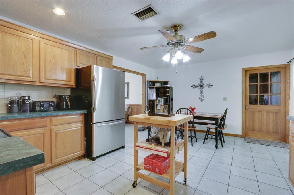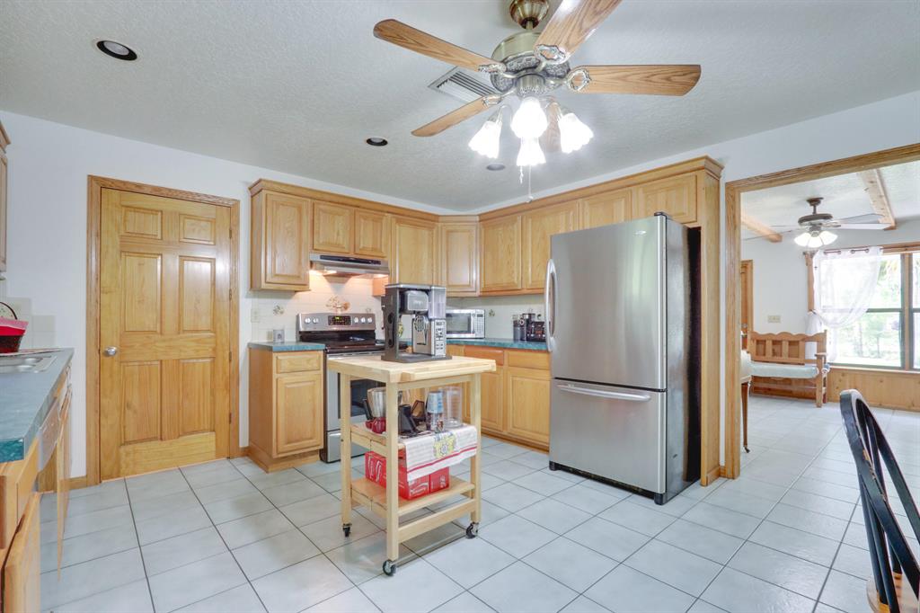 Sweet rustic ranch style home situated on a 1.33 acre with pond. Fully fenced with electric entry gate, paved double wide driveway with separate pad and eight concrete tie downs for a camper/boat. Poultry pen. Two car garage. Stainless appliances, (stove is only 2 month old) tile throughout with screened porch. Mud/laundry room. High hats, beamed ceiling in LR, knock down ceilings with crown molding in master BR. 30 amp breaker box for rear campers with water and sewer hook ups (pump does not convey) Circuit box for generator, garage also has an additional 220 volt outlet. Freezer & refrigerator in garage do not convey. Water cooler & kitchen rolling island also so not convey. There are security spot lights at all corners of the home plus security lighting in the back yard.