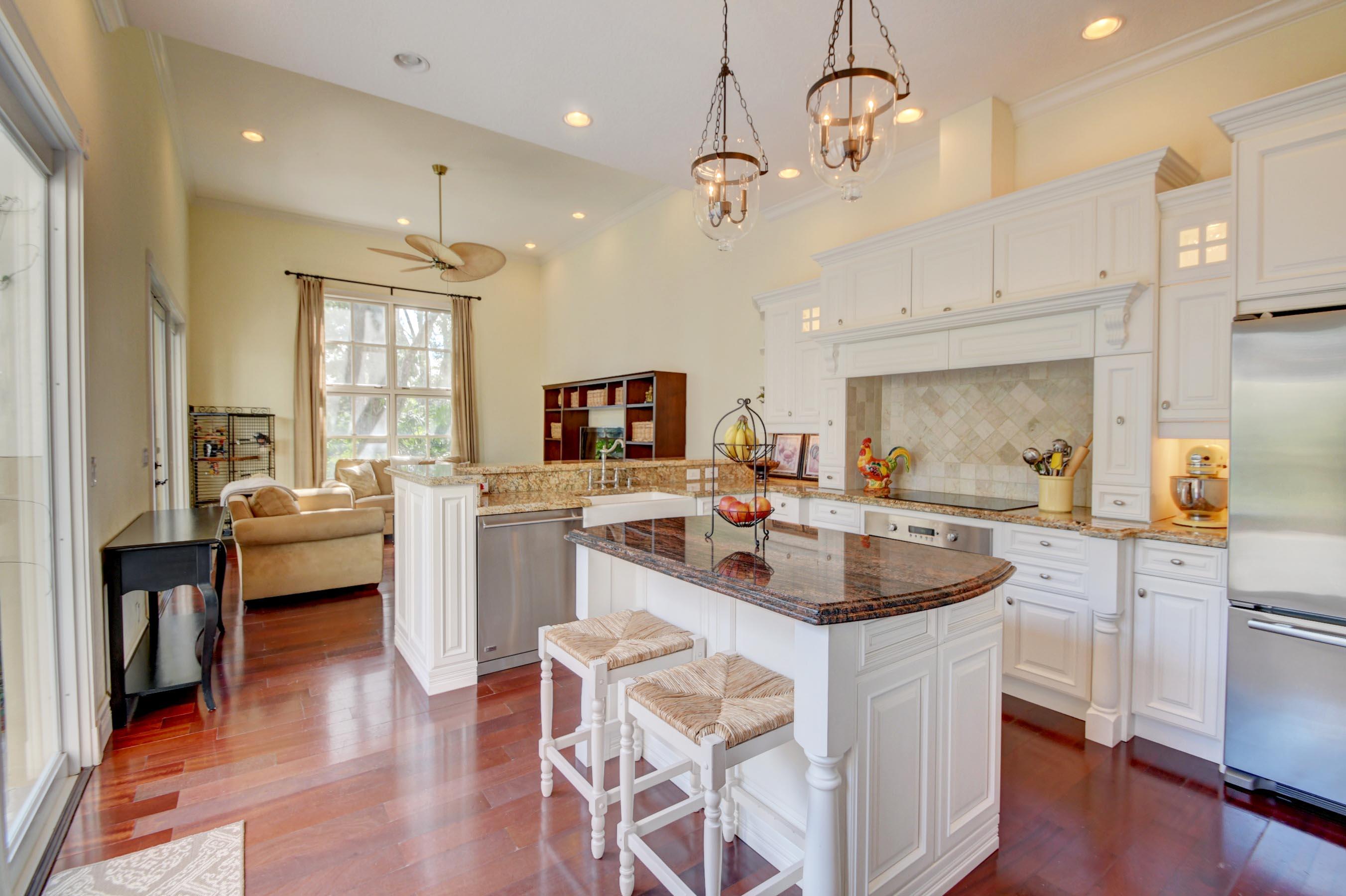 Plenty of sunlight fills this lovely townhome of 3 bedrooms & 2 1/2 baths which has been tastefully renovated. It features dark engineered wood floors; plantation shutters throughout;a charming wood-burning Living Room fireplace; a remodeled island kitchen with white cabinetry, granite counters, tumbled marble backsplash & stainless steel appliances; remodeled Master, secondary & powder bathrooms; crown moldings & extra high-hat lighting; new baseboards; custom lighting & fans; newer washer & dryer and impact windows & doors around the courtyard. The spacious courtyard features new pavers & offers a covered lanai, open patio & private greenbelt views. The air conditioners were replaced 2011 & 2015; solid wood doors-2015; water heater-2008; garage doors-2008; new roof-2008.