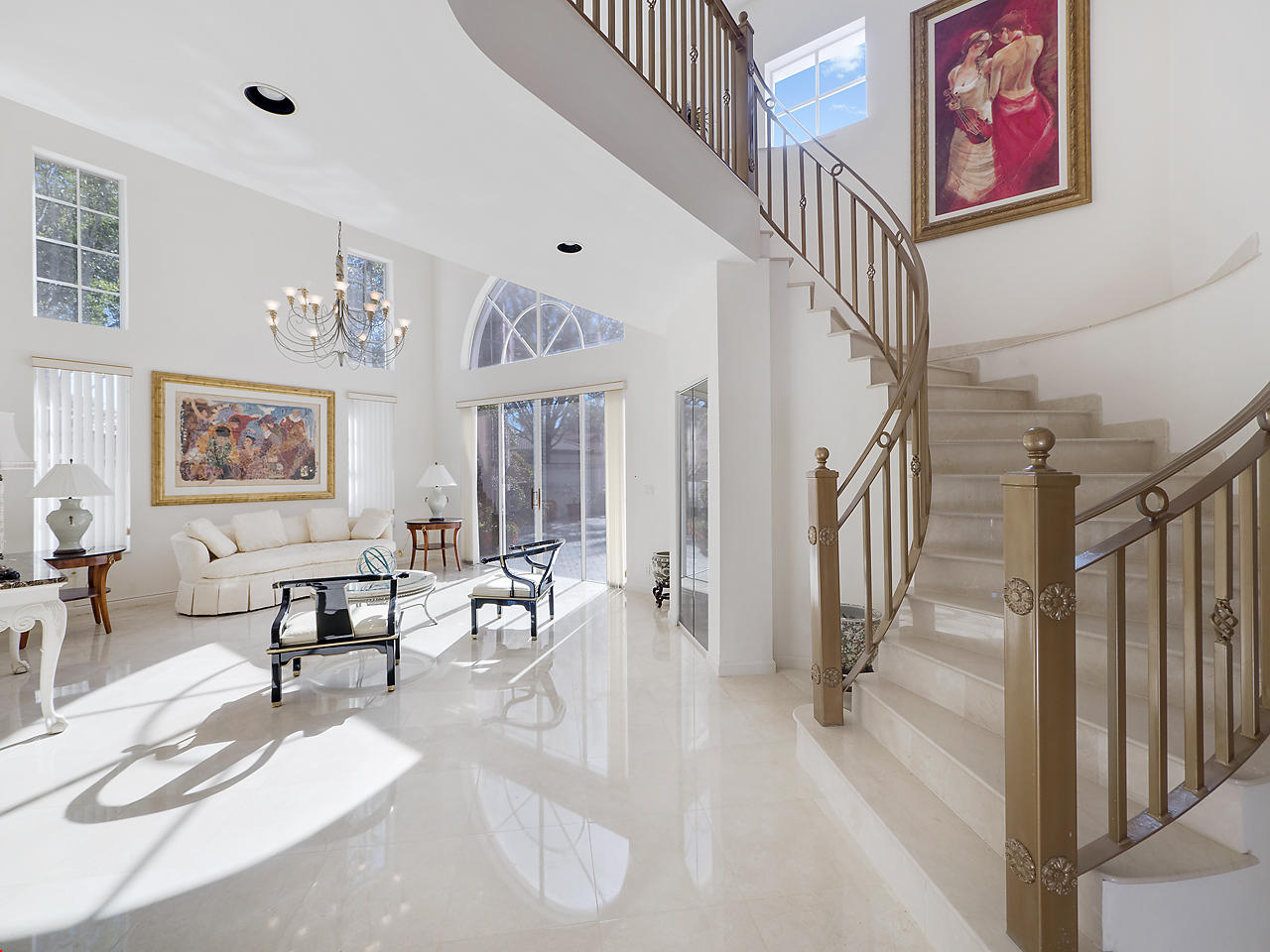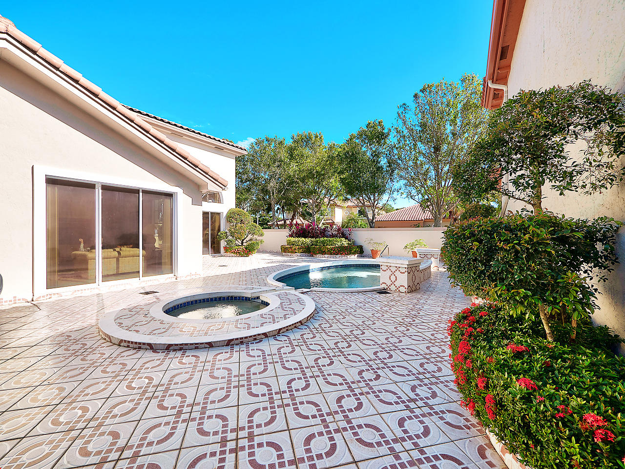 Discover resort-style living without equity cost in a luxurious Boca Raton/Santa Barbara pool home on a corner lot. Double doors welcome you to a Foyer and spectacular winding brass banister staircase. A spacious Living Rm with soaring 20 ft ceilings & glass slider leads to a large private tiled lanai with gorgeous pool & spa. Home boasts 4 BD & 3 BA, marble tile thruout, large island Kitchen, Breakfast Rm & Family Rm. overlooking outdoor pool & spa. Master Suite includes double vanity, Jacuzzi tub, separate shower, water closet & walk-in fitted closet. Near to the magnificent Santa Barbara clubhouse, pool, tennis, exercise facility, banquet center & more, the home is close to shopping, A+ schools, library, I-95, Turnpike, all three major airports and short hop to the ocean. Visit Today!