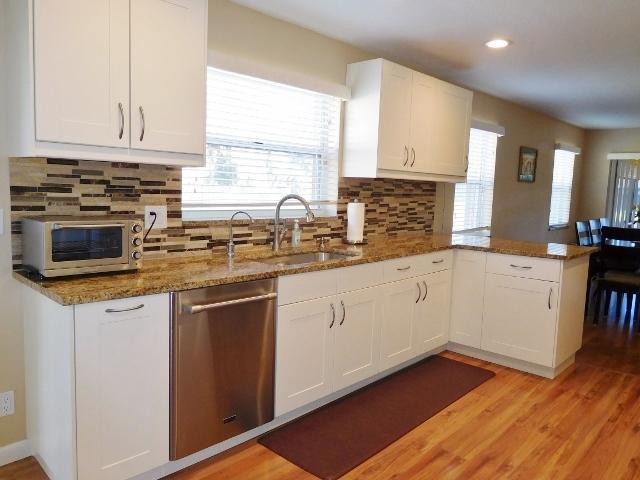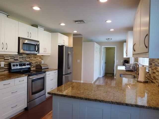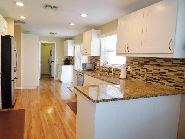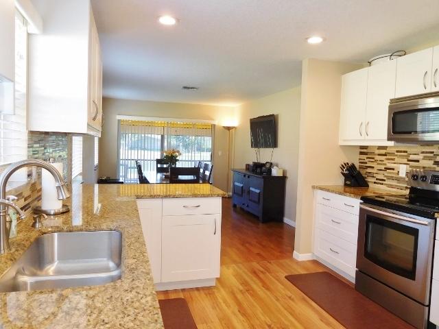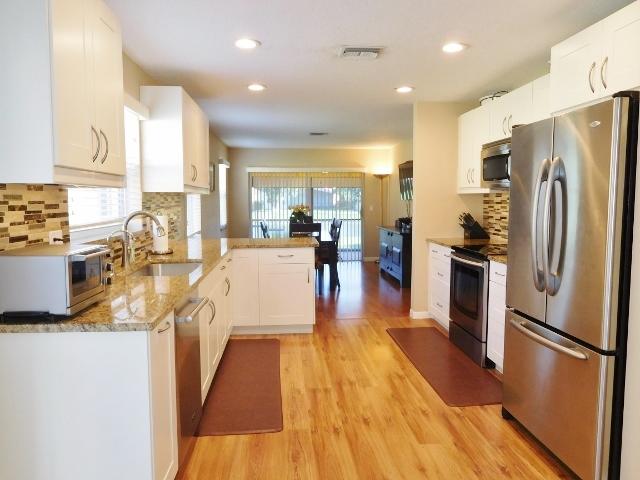 Beautifully remodeled 3BR/2BA Spanish Mediterranean Aspen model Lakefront home on oversized .2 acre fenced lot on cul-de-sac in gated community. Volume textured ceilings w/NO popcorn & crown moldings. Laminate floors thru-out. White kitchen cabinets & custom pantry. Granite counter tops & stainless appliances. Laundry room with newer washer, dryer & sink. Remodeled baths. Master has dual vanities, whirlpool tub with heater & walk-in tiled shower stall. Canopy covered screened patio & paver brick side. Accordion Hurricane Shutters. 2 car garage. House is networked with cat5e. Community has gigabit fiber to home. Includes Nest thermostat & smoke/carbon monoxide alarm. Living area is setup with surround sound speakers(included). Community clubhouse, social, fitness,2 pools, hot tub & tennis.