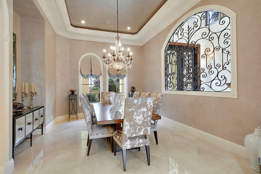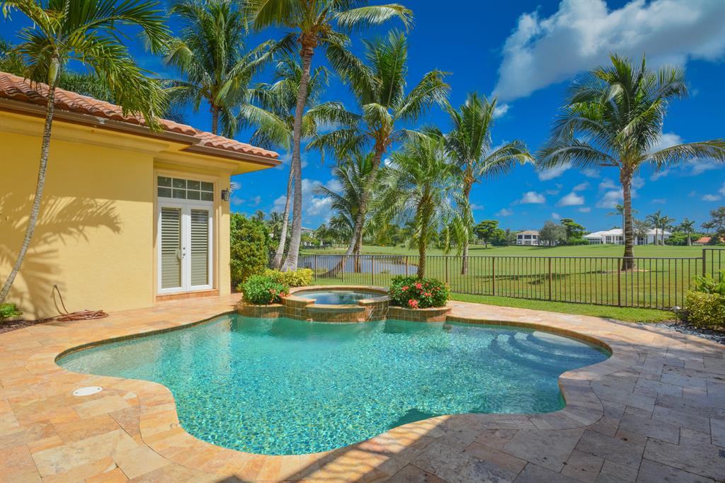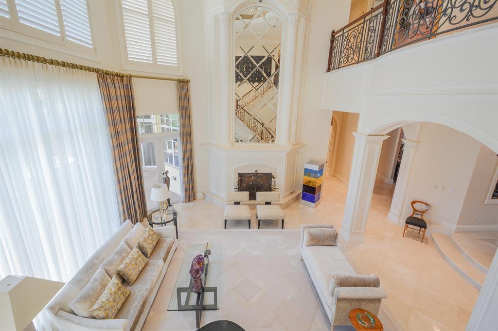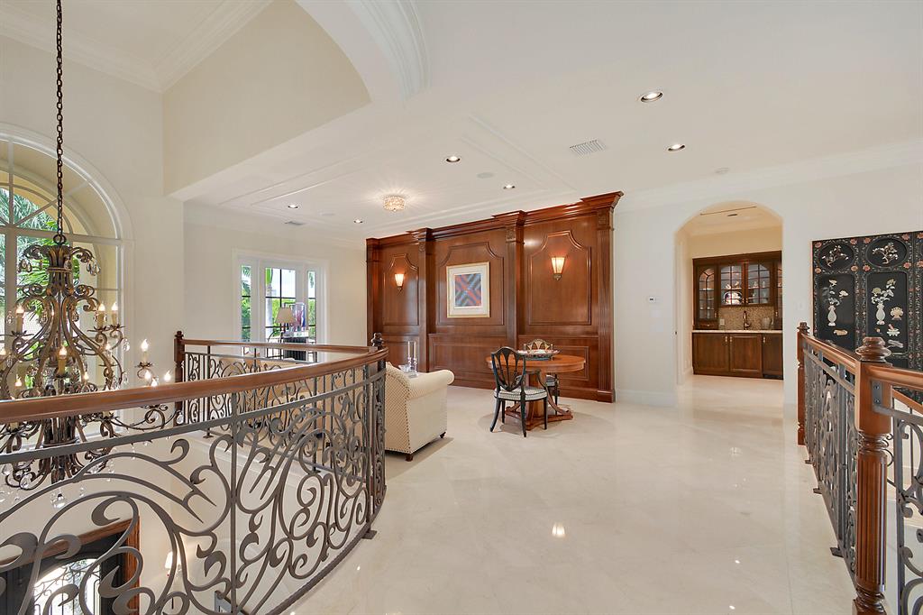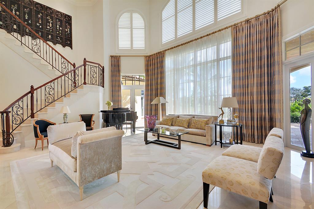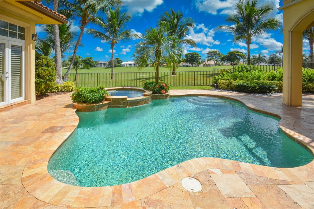 The epitome of sophistication and elegance, this beautiful classic Palm Beach inspired estate features a formal living room, dining room and gourmet chef's kitchen, breakfast room and large family room all designed for effortless entertaining or casual living. The master wing includes a grand master suite with luxurious his and her marble baths, generous closets and customized wood paneled library. An additional guest suite is located on main floor. Four en suite guest bedrooms, a home theatre and loft area, and additional laundry are on the second floor. An outdoor entertainment area is lushly landscaped with breathtaking panoramic golf course vistas and features a resort style pool, covered loggia and summer kitchen. Other amenities include hurricane resistant windows and doors,