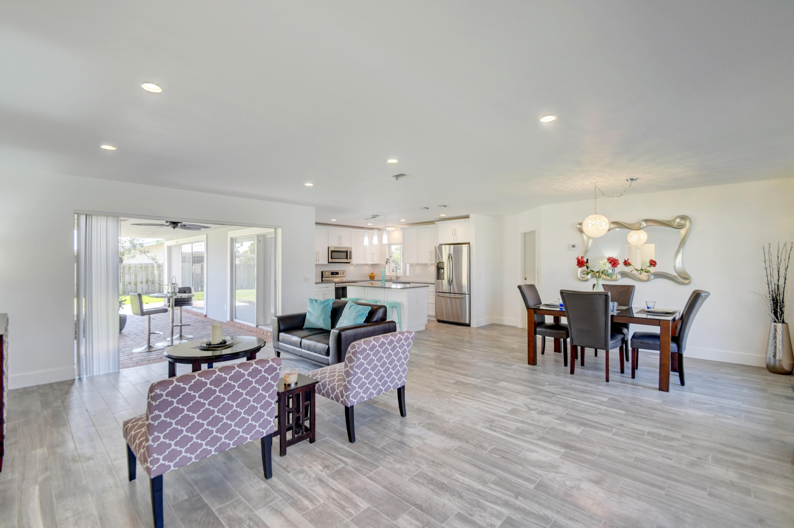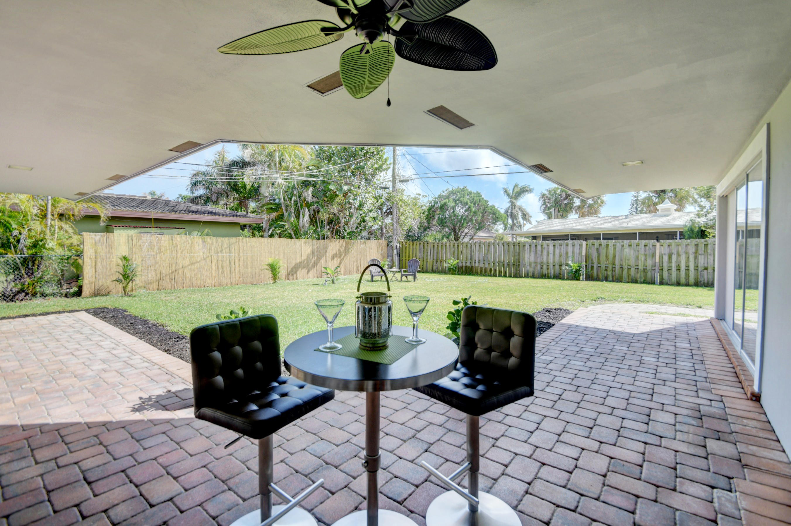 Great location on a corner lot! This 3 bedroom, 2 bath home has a 2 car side entry garage and has been remodeled with new floors, new kitchen with quartz counters, and new baths. New porcelain wood look tile through out and brick pavers outside. Enjoy the huge backyard with a covered patio for entertaining. Plenty of room for a pool and to park a boat on the side of the yard. Open floor plan with split bedrooms. New AC, new water heater, new outside electric panel, new PGT impact windows, new impact doors, impact garage door with wifi enabled opener. A-rated school district. Minutes from downtown shopping area and beaches. Just bring your toothbrush!