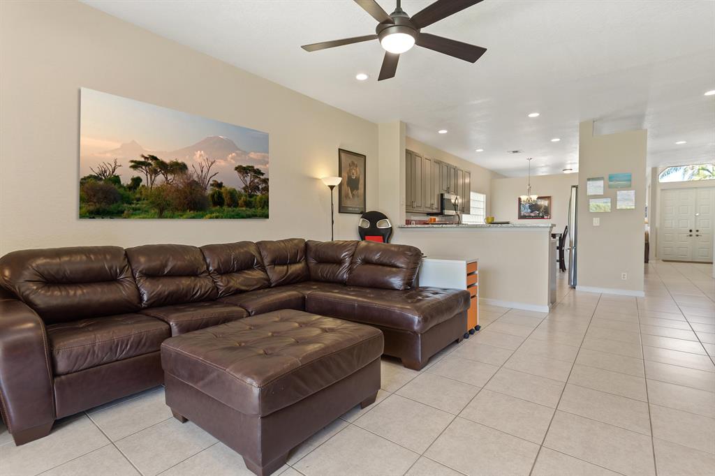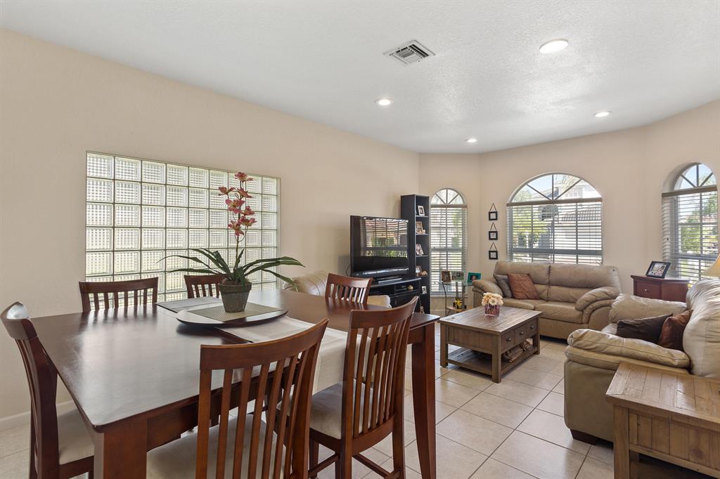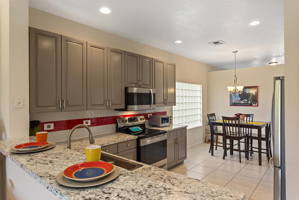 WELCOME HOME. This property will delight you! Open your double door entry to lots of natural light. Pretty light tile in living areas. Living room with beautiful bay window. Soaring ceilings with knock down finish. Open floor plan features a gorgeous kitchen with 42'' wood cabinets, brushed knickel drawer pulls, STAINLESS STEEL Kenmore ELITE appliances-4 years new! Breakfast knook and eat-at counter. Entertaining is a breeze - spacious family room opens to covered patio for gatherings. Large MASTER SUITE with trey ceiling & 2 huge closets . Relax in your Master Bath with double vanity, separate shower & Roman tub. Generous sized guest bedrooms! OVERSIZED pie shaped lot. Ext painted 3 yrs. Paver driveway widened. MRS. CLEAN LIVES HERE! Move right in. A+ schools, Low HOA & Gated