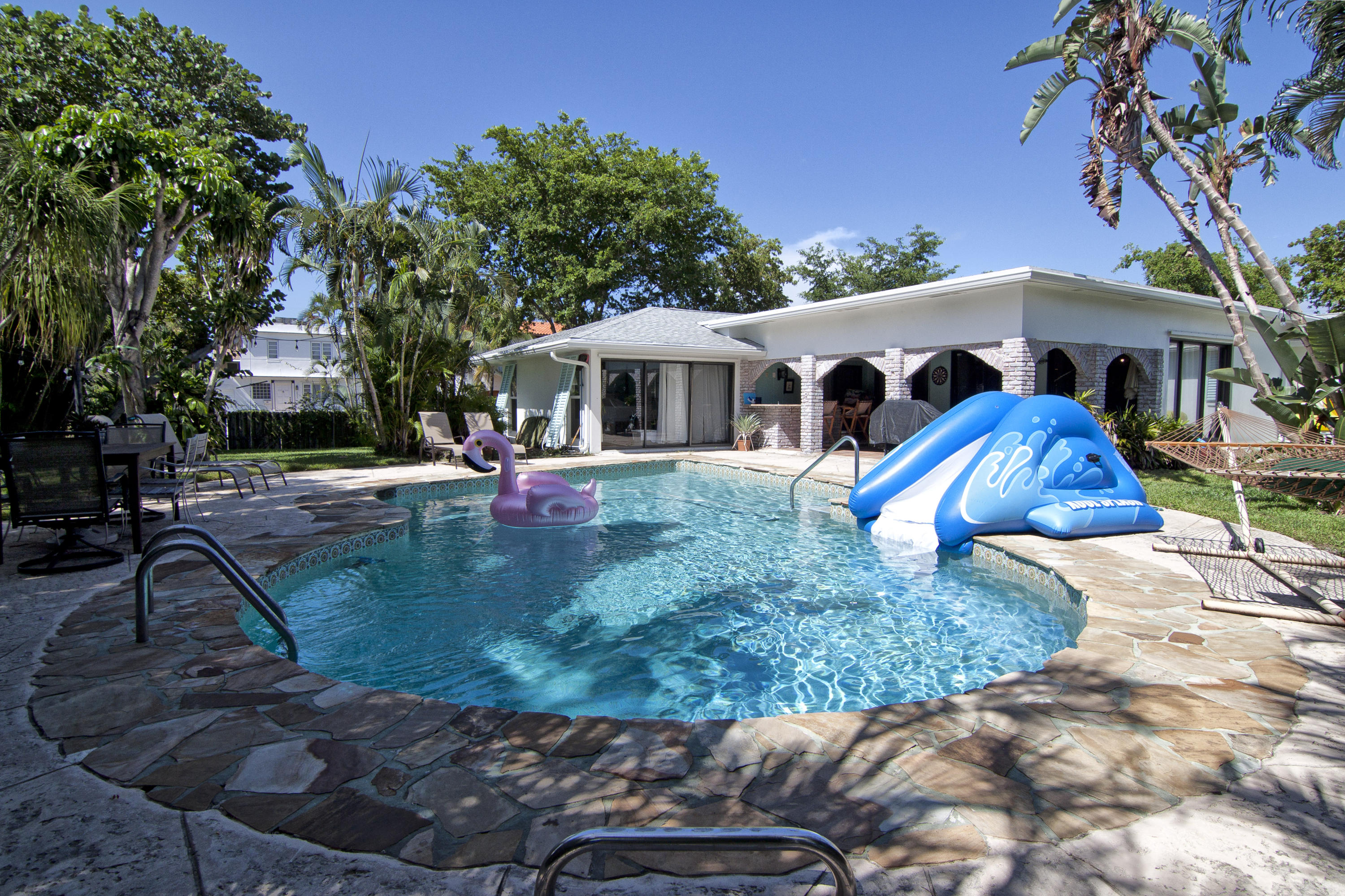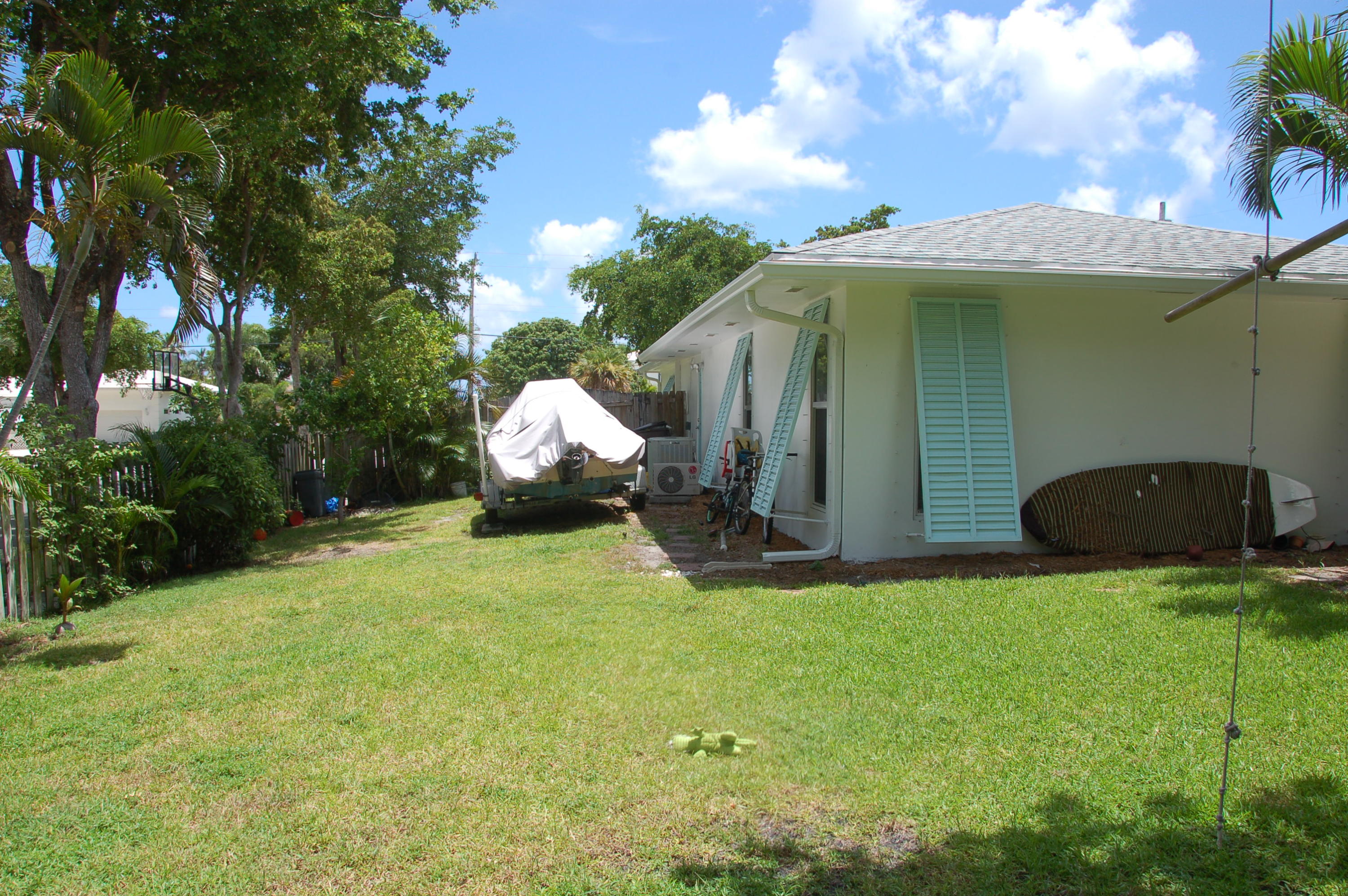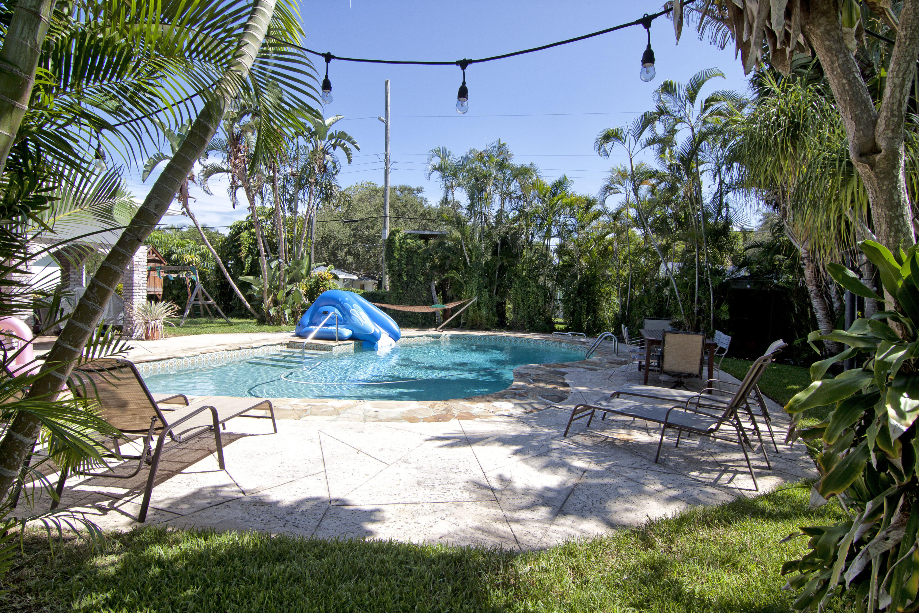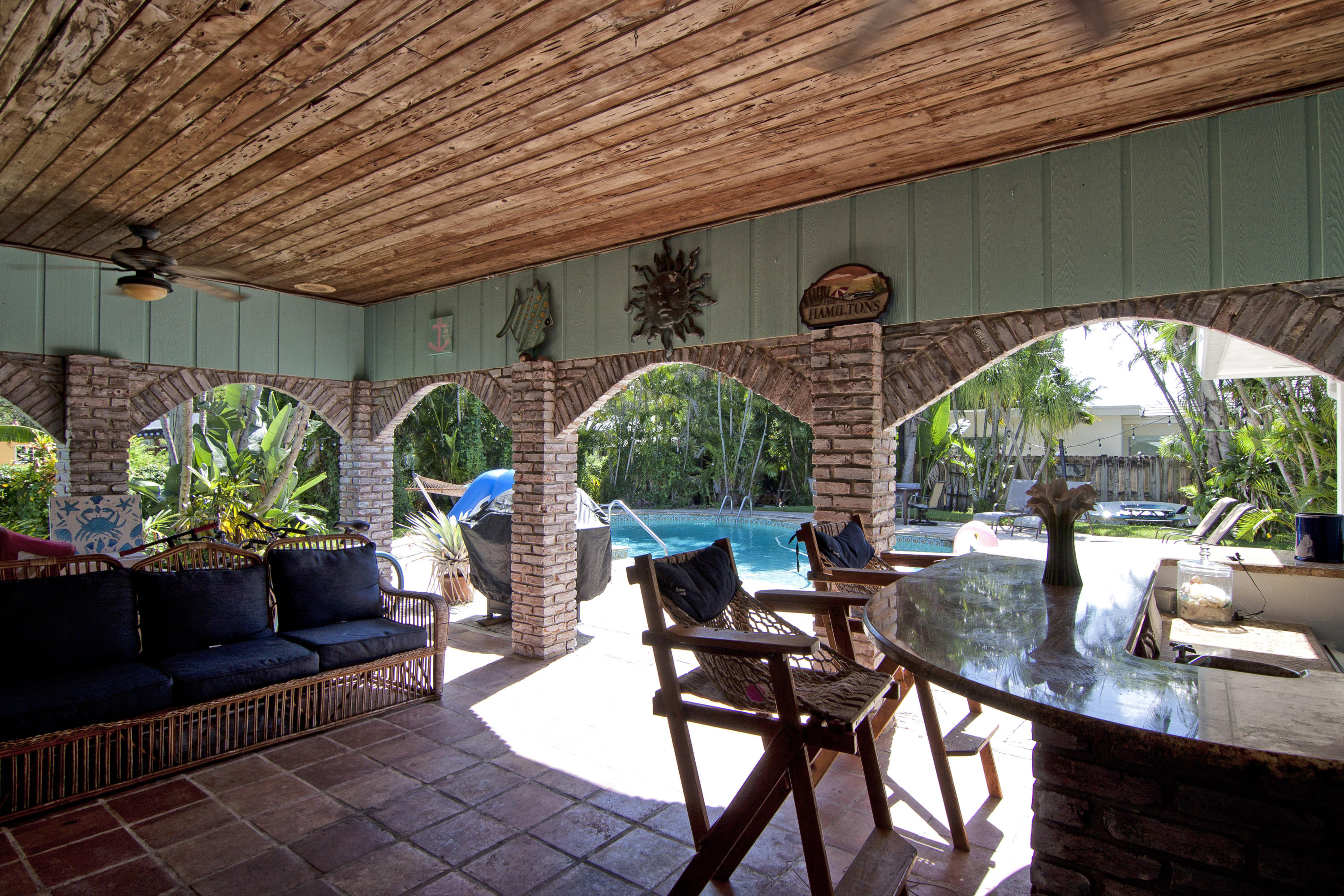 Charming Bermuda-style ranch on an elevated, double lot (.345 acre) just 1 block from the Intracoastal waterway. Nice lot elevation - no flood insurance required for these owners. 3 Bedrooms and 2 1/2 bathrooms with a split floor plan. Newer kitchen with granite & breakfast bar. Large master with huge walk-in closet. Entire backside of house is sliding glass doors, which provides beautiful natural light. Gorgeous tropical backyard with huge lanai & new granite wet bar. Hurricane impact windows & doors recently installed. This lot boasts a beautiful, 7 foot deep, salt water pool, & lush tropical landscaping (including a lime tree).