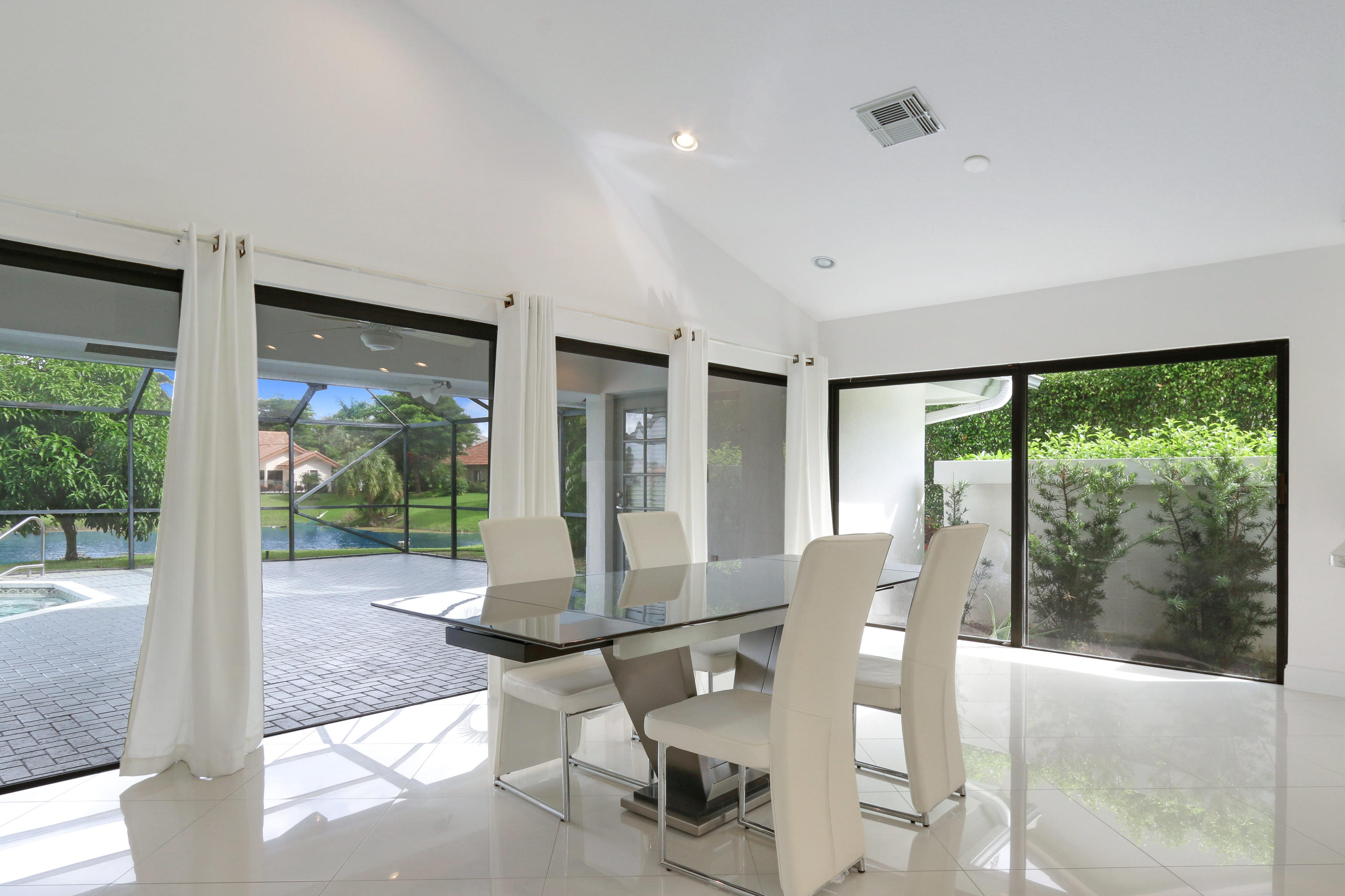 Large, open, airy & bright spaces, high vaulted ceilings and magnificent lake views give this 3 bedroom (+ den) home its' extravagant allure. Located in Encantada, one of the most desirable subdivisions in Boca Pointe, this lake-front gem, situated on a 1200sf lot is one of the 127 large lot custom homes in this exclusive area. The homes' large, modern, open kitchen with its' white cabinets and stainless steel appliances features granite counters and a mosaic marble back splash. The Master bath includes 2 separate vanities with exquisite marble tops, a separate toilet room, a focal point, stand-alone tub in addition to a splendid over-sized walk-in shower. White porcelain tile floors span through out the living areas and Kitchen, and rich hardwood floors invite( conitnued more... )