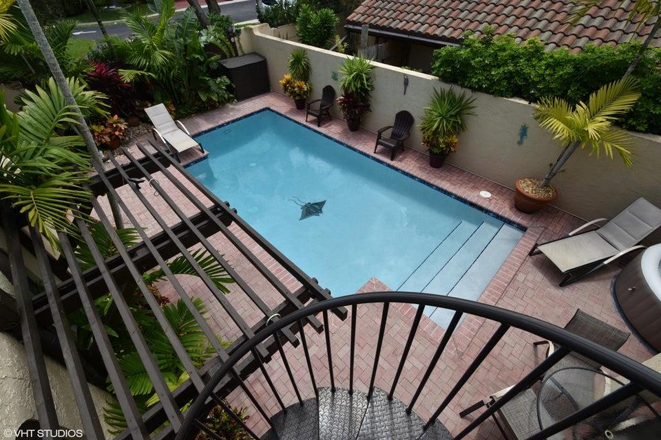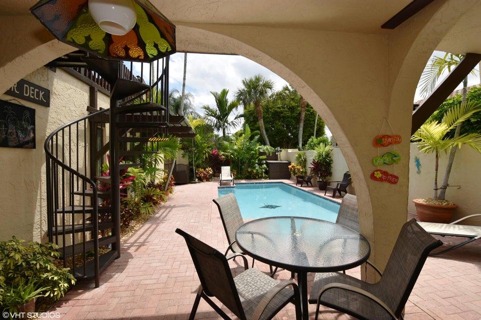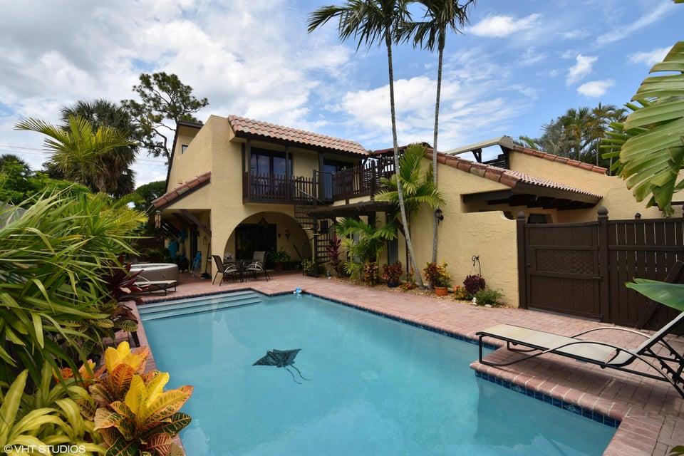 Rarely Available & Totally Remodeled with $90,000 in Upgrades & No Expense Spared! One of a Kind 3 Bedroom Private Courtyard 2 Story Pool Home + Loft & 2CG! Master located downstairs. Huge Private Sun Tanning Wood Deck with Spiral Iron Staircase leading down to pool. Granite Kitchen with Custom Wood Cabinetry, Stainless Appliances, built-in wine rack and cooler! Saturnia marble flooring, Cypress wood beams, customized Fireplace, LED lighting & Hunter Douglas window treatments. 3 Completely Remodeled Baths including Jacuzzi jetted tub & Frameless Shower! New Landscaping, pool pump & filter, & ''Sunbrella'' canopies. Located in the exclusive & popular Central Boca Del Mar area. Low HOA fees! A-rated schools!