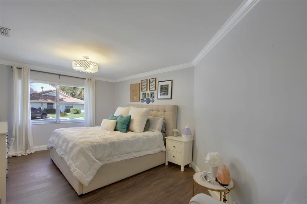 Welcome home to this completely remodeled one story villa in the wonderful all age community of Boca Walk. The kitchen and both bathrooms in this beautiful villa have been meticulously renovated with solid hardwood cabinets and granite stone throughout. In addition to the porcelain wood flooring flowing through the oversized master bedroom and guest bedroom. The master bathroom features a dual vanity sink, frameless glass shower doors, and a walk in closet that is completely built out with large drawers, hanging space, and locking jewelry drawers. All of your large mechanical features have also been update with a brand new AC installed this month and tankless hot water heater installed last month. Do not miss out on this opportunity to move into a great centrally located neighood