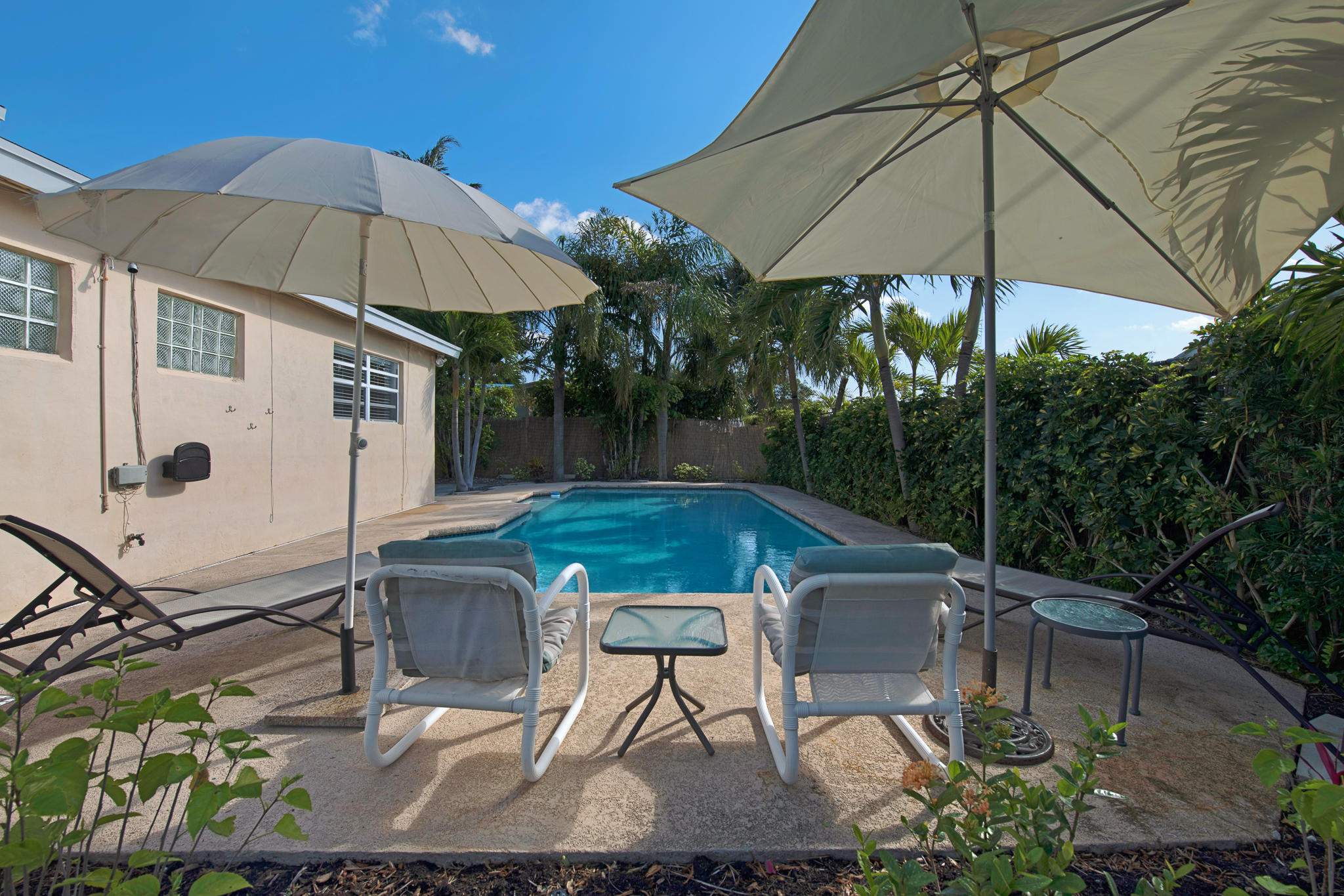 Charming, light-filled 3/2 home, located in SoSo (South of Southern) w/ fireplace, tile flooring, tropical backyard pool & pergola. Remodeled kitchen and baths. Carport. Newer appliances and AC. Located on a private cul-de-sac street w/ access to Flagler Blvd. & Intracoastal. Fenced back yard is great for entertaining. Lowest priced pool home East of Olive Ave and U.S.1 Located in the desirable South Olive School district. Room sizes may not be exact. Good investment potential.