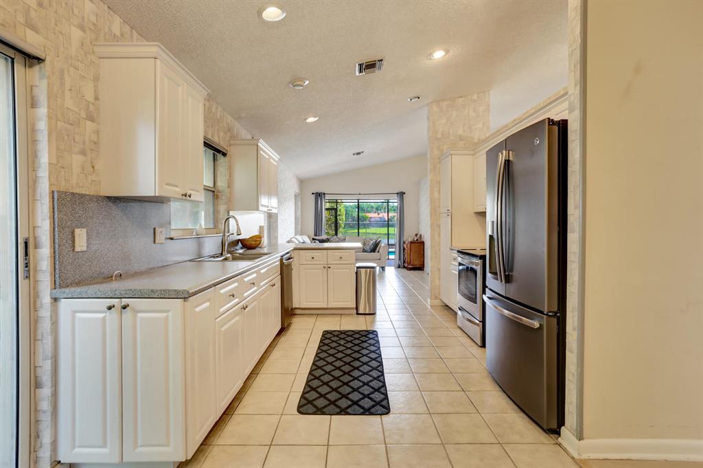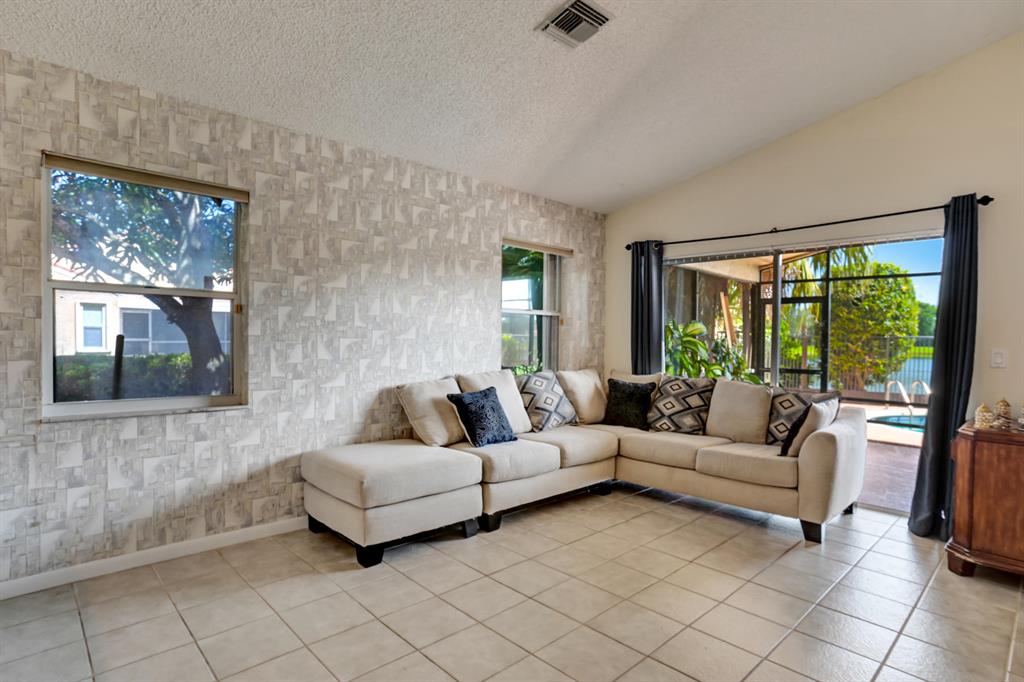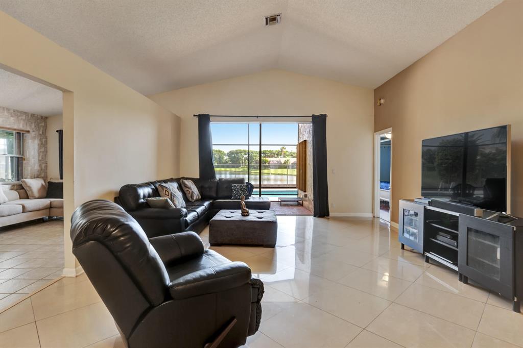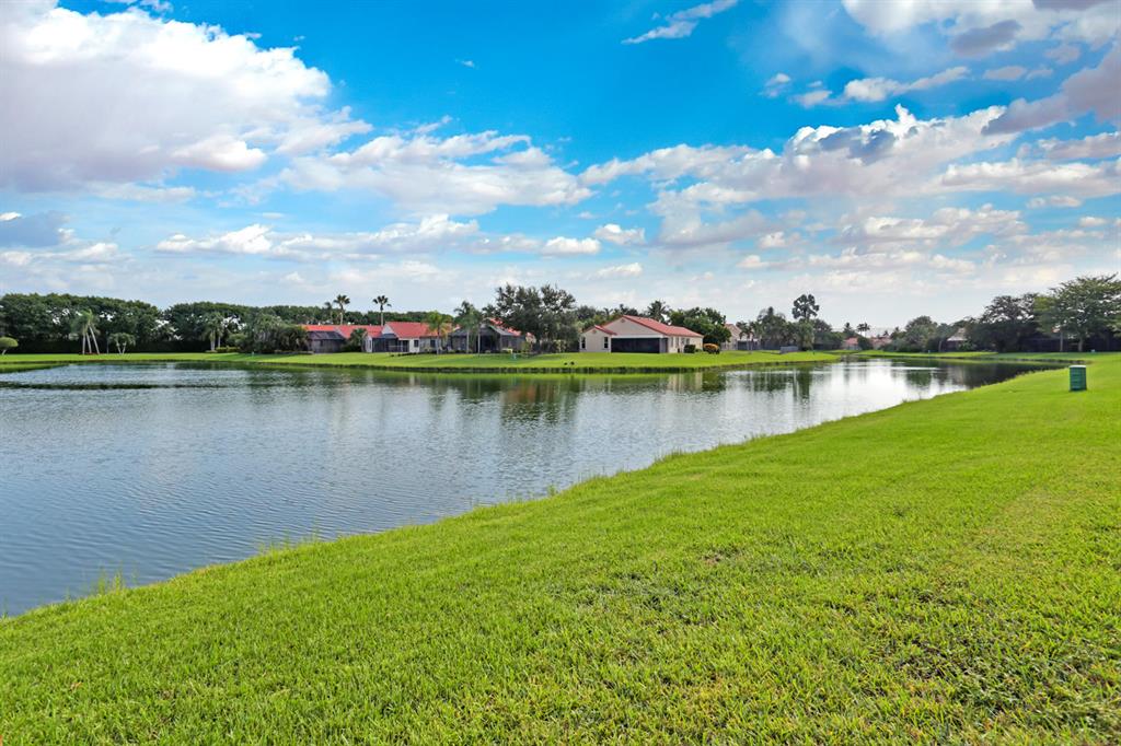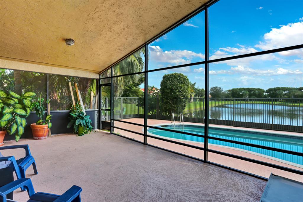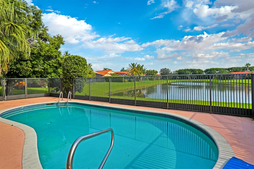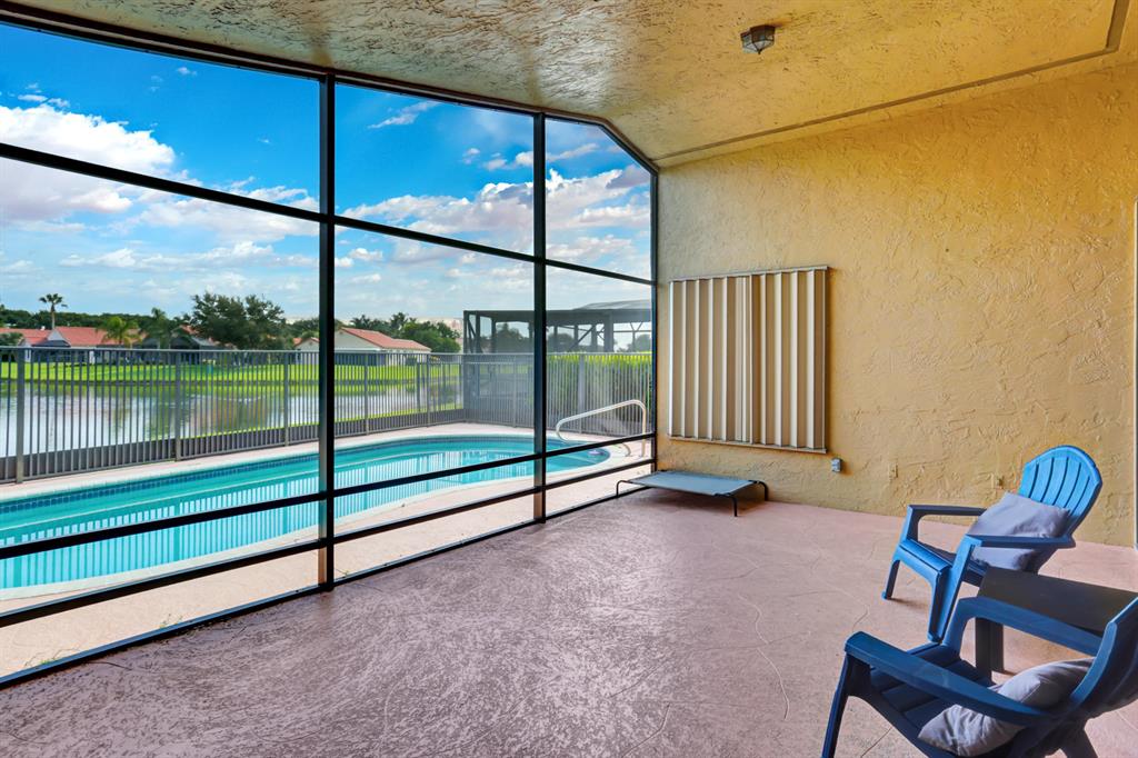 From the moment you walk through the double front doors of this 3 bedroom / 2 bathroom pool home with a 2-car garage, you'll be captivated by the gorgeous lake view and feel the openness of the living area with vaulted ceiling. There is beautiful neutral color tile in the living and formal dining rooms and laminate in the kitchen and bedrooms. The kitchen is equipped with stainless steel appliances and plenty of nice white cabinets. It is just steps away from the sliding doors leading you to the heated fresh water pool and a big screened covered patio. The patio is fantastic for relaxing or hosting a BBQ all while taking in the serenity of the stunning lake from the iron fenced backyard. The master bedroom features a walk-in and a regular closet. One of the guest bedrooms also offers a