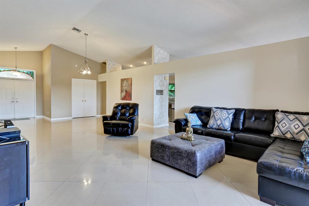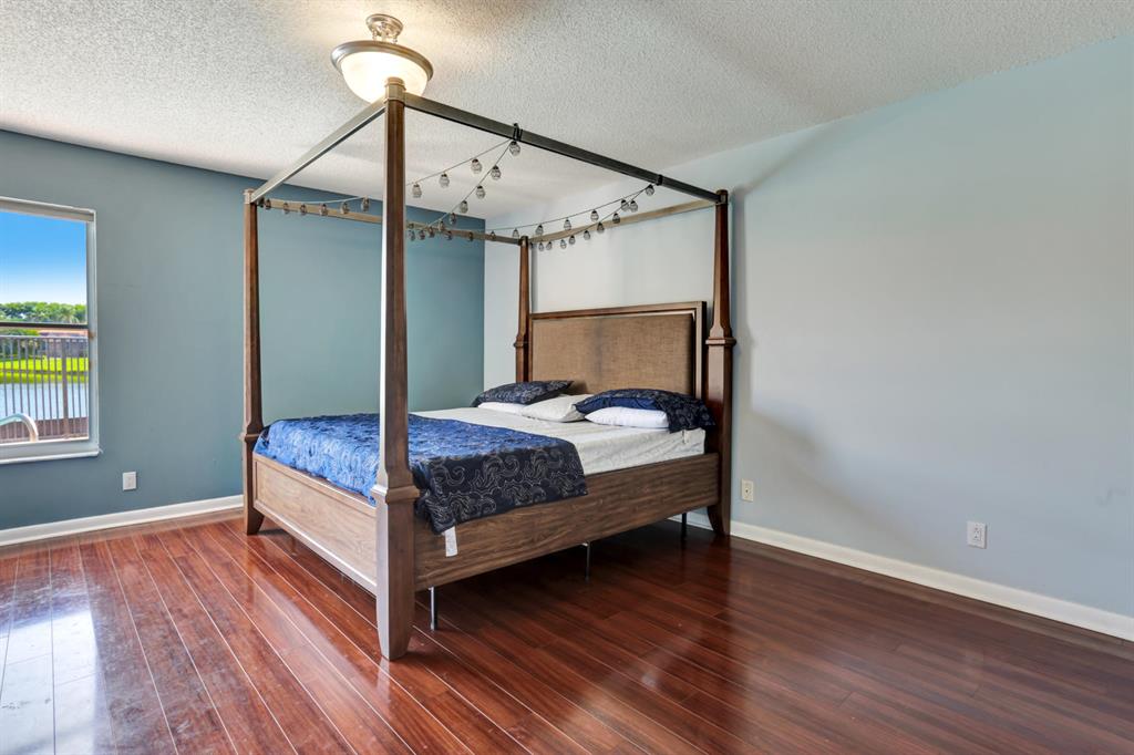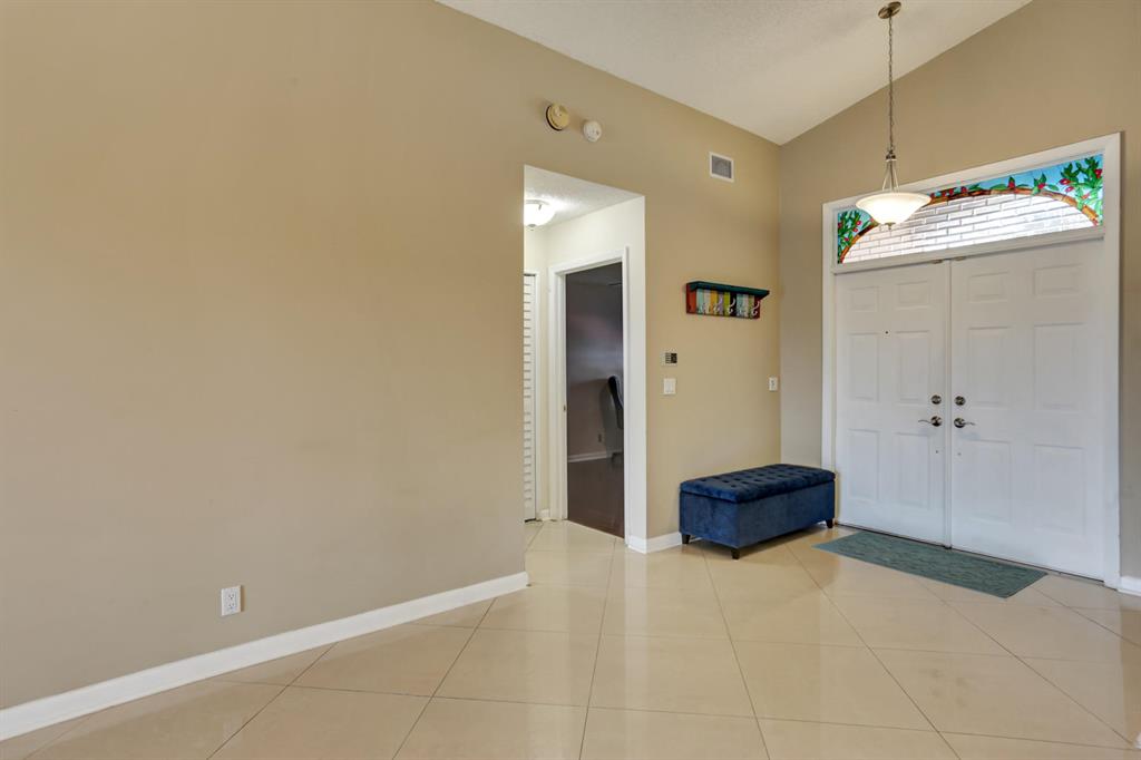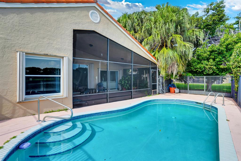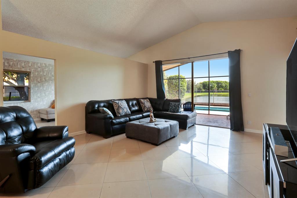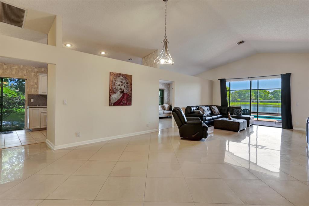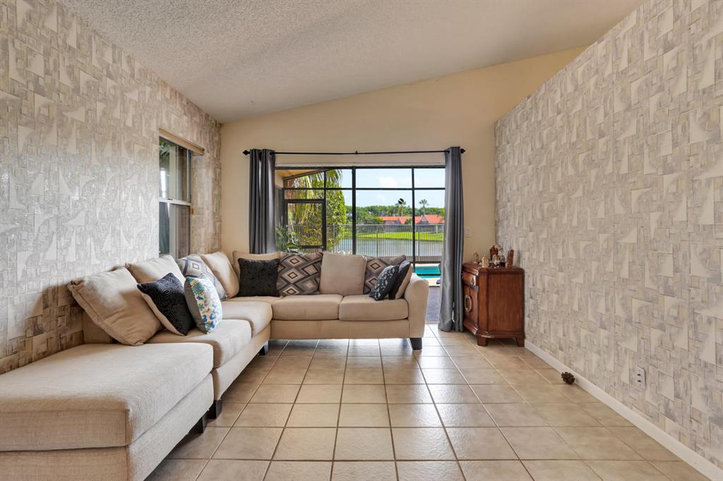 From the moment you walk through the double front doors of this 3 bedroom / 2 bathroom pool home with a 2-car garage, you'll be captivated by the gorgeous lake view and feel the openness of the living area with vaulted ceiling. There is beautiful neutral color tile in the living and formal dining rooms and laminate in the kitchen and bedrooms. The kitchen is equipped with stainless steel appliances and plenty of nice white cabinets. It is just steps away from the sliding doors leading you to the heated fresh water pool and a big screened covered patio. The patio is fantastic for relaxing or hosting a BBQ all while taking in the serenity of the stunning lake from the iron fenced backyard. The master bedroom features a walk-in and a regular closet. One of the guest bedrooms also offers a