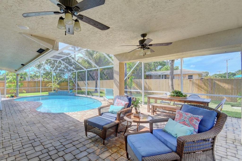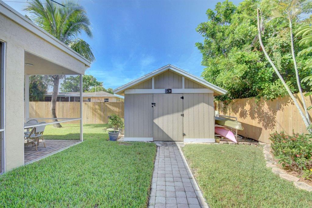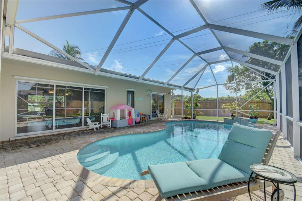 Beautiful, move-in-ready home in highly sought after East Boca Square neighborhood & A+ rated Addison Mizner School District. This 3BD/2BA split floor plan home features a rare 14'x24' roof covered outdoor entertaining patio space with built-in surround sound, slate bar pass-thru to kitchen & fully screened-in salt water pool w/waterfall. The home features a 1.5 car garage w/ A/C, a circular paver driveway and oversized storage shed. Yard offers brand new fence with gate access for boat/RV parking & 3 mango trees. The interior features an updated kitchen with 42'' custom wood cabinets w/glass inlay, granite countertops, stainless steel appliances and an interior laundry room w/shelving storage. Master bedroom suite offers walk-in closet & 3 piece bath. NO HOA! Short walk to Addison Mizner.