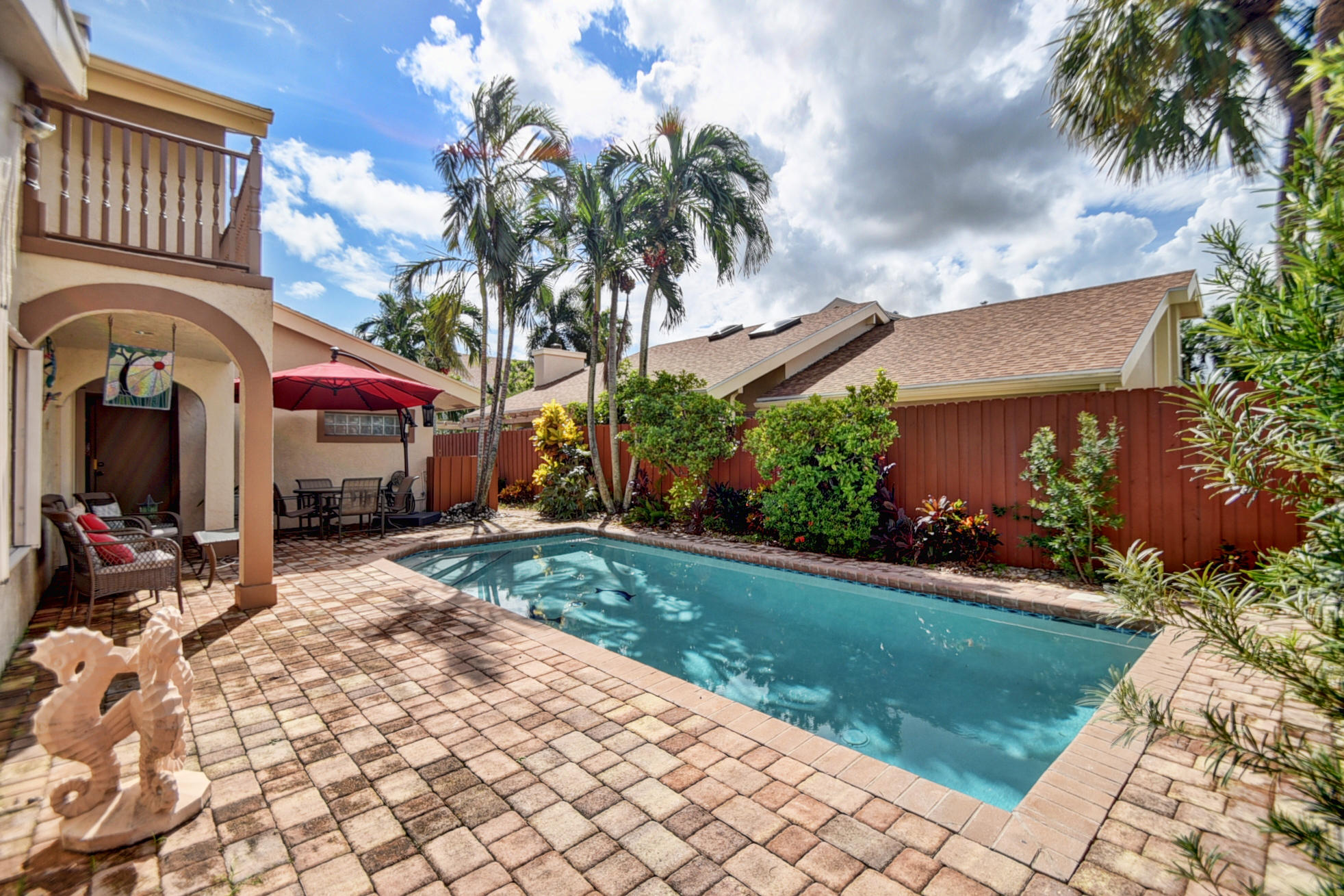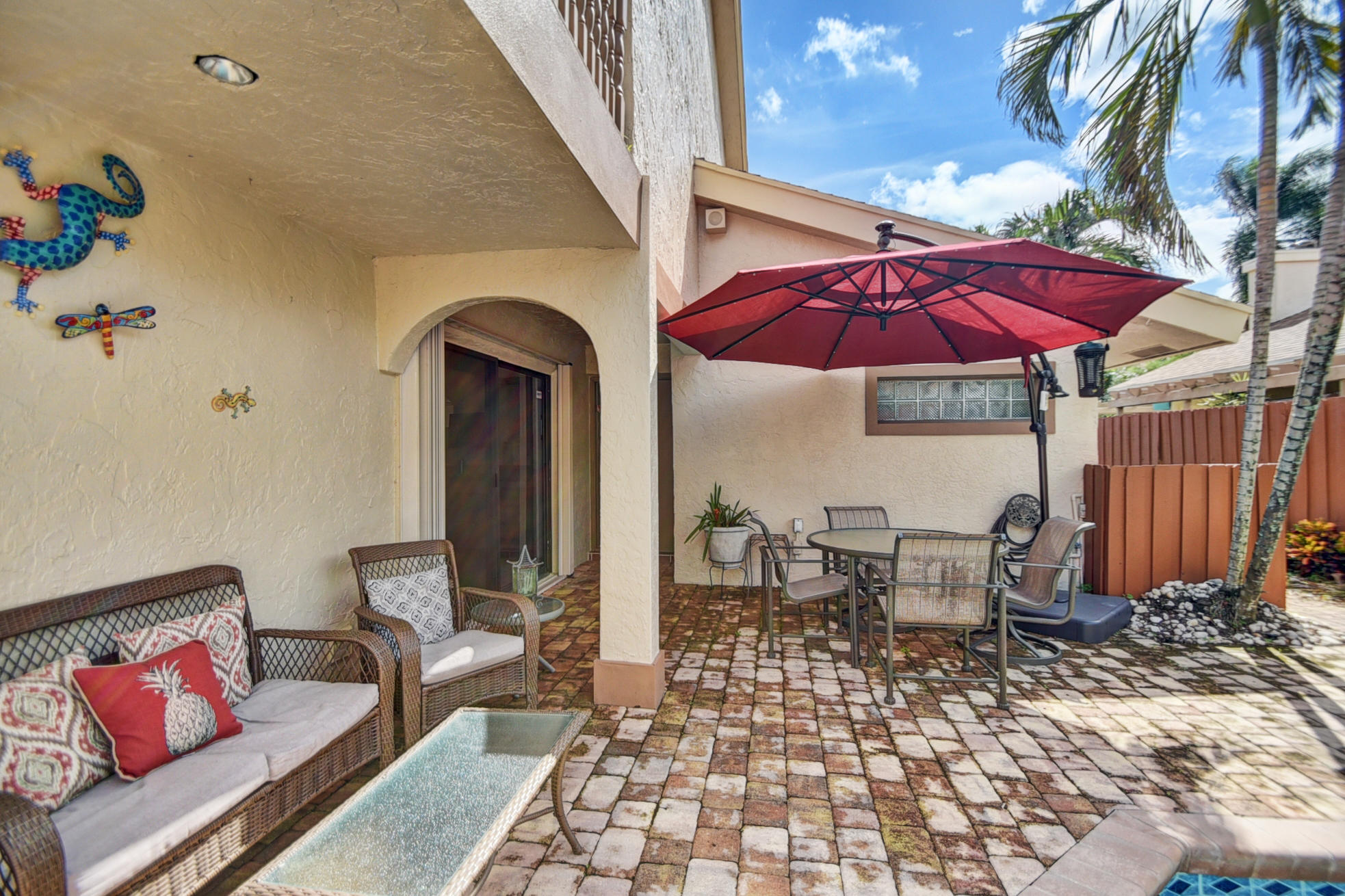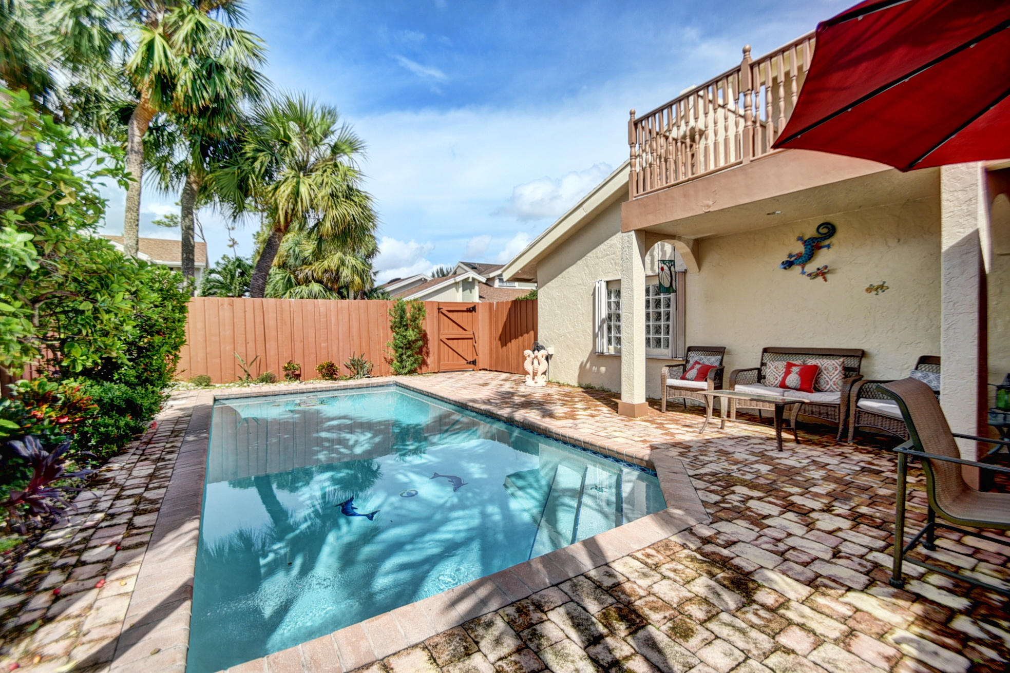 Centrally located in Boca Raton, enjoy this charming 2 story townhome. Walk in through your own gated paved private courtyard w/huge pool. Featuring 4 beds/2.5 baths/2 lofts/2 car garage. Updated kitchen w/built in double ovens,wine cooler,stainless appliances & granite counter tops. Updated bathrooms w/marble. Coral fireplace in the living room w/french doors leading to huge outside deck, formal dining room, downstairs master suite w/large walk in closet. Upstairs has 3 bedrooms, 2 lofts + balcony w/ pool views. High ceilings & open floor plan gives a feeling of space. Great location! Walk to A+ rated Del Prado Elem & places of worship. Low HOA fee only$210/month includes exterior paint/lawn/basic cable/community pool/pet friendly
