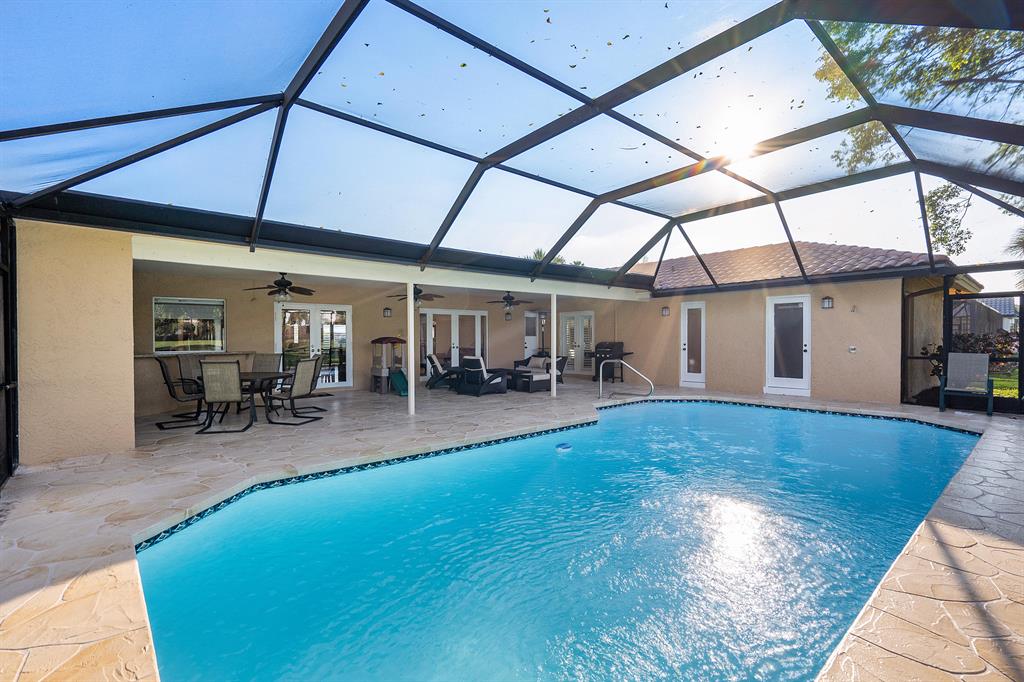 Updated home on beautiful golf course lot.This freshly painted (inside and out) home has 4 bedrooms plus an air conditioned bonus room,3 1/2 baths,2 car garage and features a circular drive,hurricane protection(impact windows on three sides,fabric hurricane screen on rear patio),portable generator with electric hookup,newer A/C,roof replaced in 2006,open floor plan,French doors,plantation shutters and fans.The gourmet kitchen has been renovated with wood cabinets,granite countertops,designer tile backsplash, stainless steel appliances and all the bells and whistles!The master suite has an outfitted walk-in closet.You'll love the golf course views from the large patio with oversized birdcage featuring dining areas,lounging areas,built-in bar with granite top and large inground pool