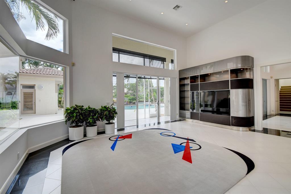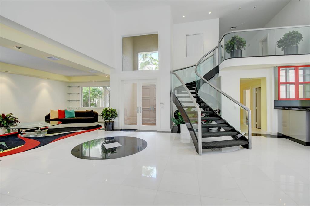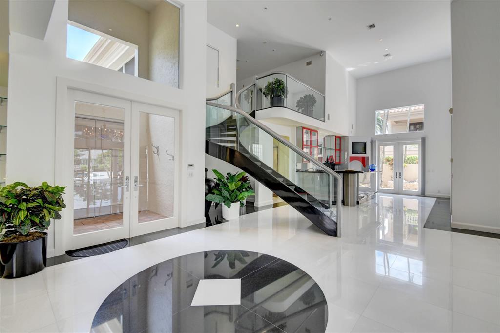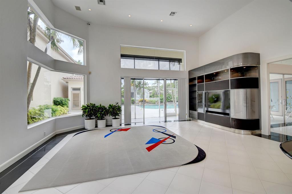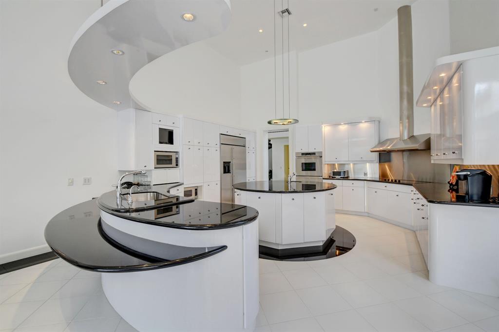 The gorgeous landscaping draws your eye to the immaculate grand foyer. Step on to a cloud of white tile enlightened by tons of natural light. The main entrance offers a full bar, formal dining room, and formal living room. The unique design of the kitchen offers guests a panoramic experience since the kitchen opens up to the family room. Granite countertops, an abundance of storage, and a fabulous breakfast bar make this kitchen ideal for entertaining and intimate meals simultaneously. The master bedroom is part of a master suite including extra large outfitted closets, his and hers bathrooms, a terrace over the pool and lake, an exercise room plus full executive office and bathroom. Guest bedrooms are located on the first and second floor complete with en suite bathrooms and sizable