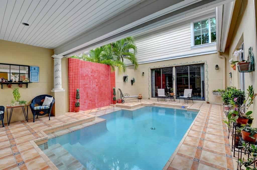 Just reduced & priced to sell! Located on a private oversized corner lot, this lovely 2-story townhome of 3 bedrooms (2 Masters up & one down) & 3 baths is tastefully upgraded offering marble floors; a faux fireplace in the Dining Room; a remodeled island kitchen completed in 2005 with cherry-finish cabinetry, granite countertops & stainless steel appliances; marble staircase; custom window treatments; stackable washer & dryer upstairs; 3 new smoke detectors; upgraded alarm system & more! The inviting courtyard area is tiled, offers a pool & backs up to a greenbelt area. Partial hurricane protection includes impact windows,front & garage doors; sliding doors around courtyard are not impact. The roof was replaced in 2006. The air conditioning units were replaced in 2013 & 2018.