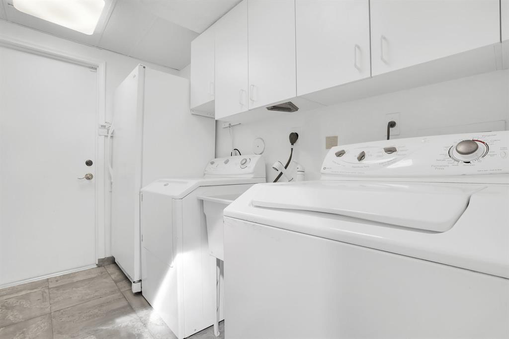 Let the sun shine in! So much natural light flows in through the clerestory windows and sliding glass doors giving this open, dramatic home such a cheery feel. High volume ceilings, sparkling lake view, oversized screened patio + fenced area for pets or playset. Updated eat-in kitchen w/modern motif features white glossy cabinets w/stainless handles, granite counters & backsplash, stainless steel appliances, pantry w/pullouts, pot drawers & large stainless sink. Master suite on 1st floor w/high ceilings, laminate floor, walk-in closet + secondary linear closet, large shower w/Grohe body sprays & a soaking tub. NO POPCORN on ceilings! All living areas are tiled. New carpet upstairs & on stairway. 2 Zone AC. Newer roof & 65 gallon water heater. Club membership NOT mandatory. Manned security.