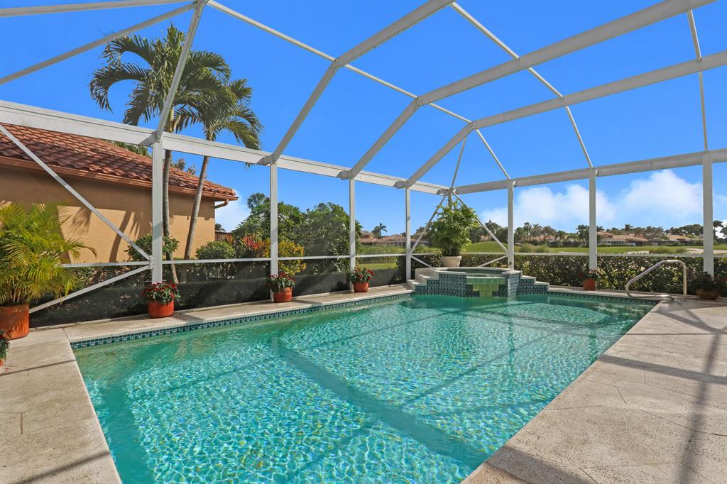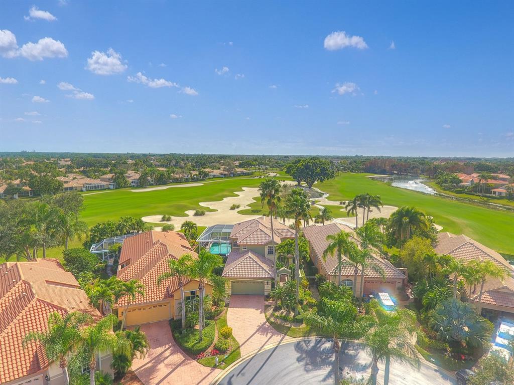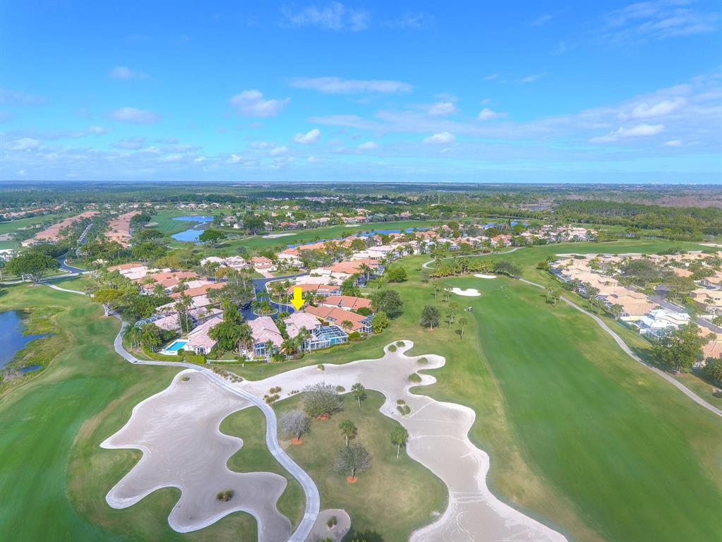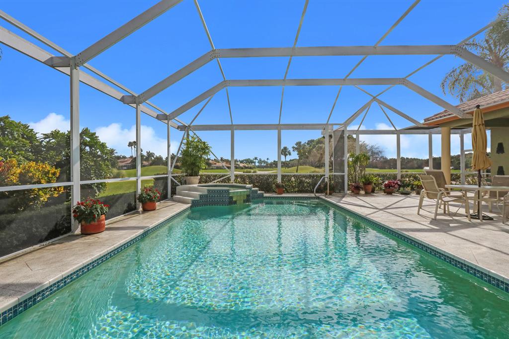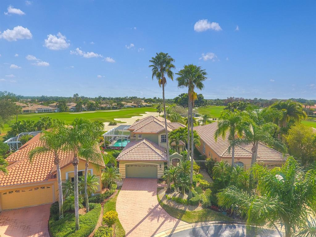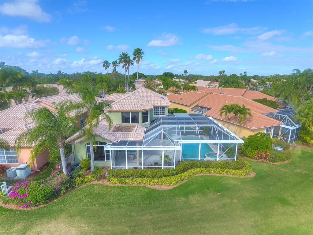 Incredible south-facing golf course views from this magnificent 3BR/4BA+Den+Loft. Located in a cul-de-sac and overlooking the first and ninth holes of the Heritage Course, this home is filled with incredible light. An over-sized cul-de-sac lot provides a feeling of spaciousness as well as a lushly landscaped side yard (perfect for the gardener or pet owner.) The large fully screened enclosure houses a large pool and spa with plenty of covered area for entertaining. The owners have made the floor plan even more open by removing walls. The flooring has been replaced with an upgraded and elegant tile. Other upgrades include: custom office built-in, granite counters, pull-outs, master closet built-in, hurricane protective film on all the windows, replaced glass front doors, elegant wood...