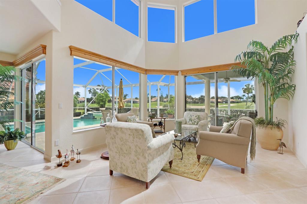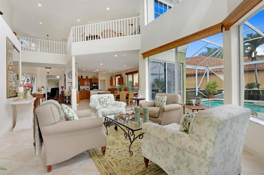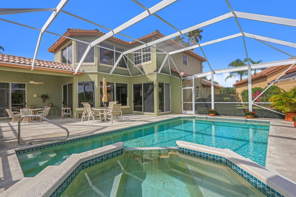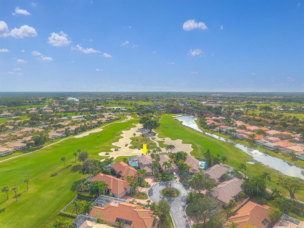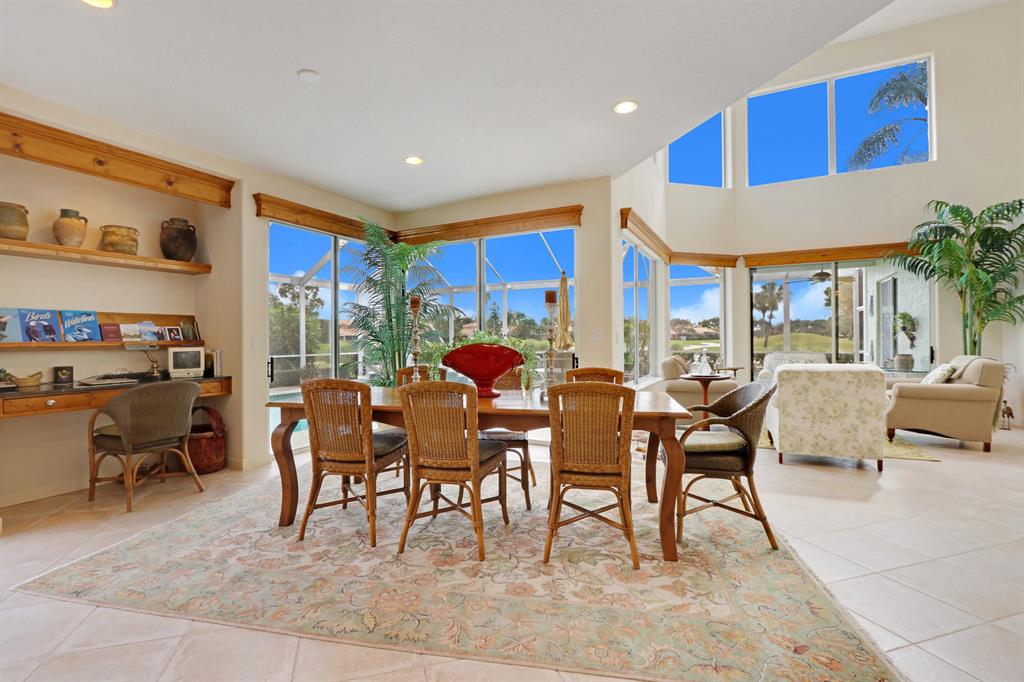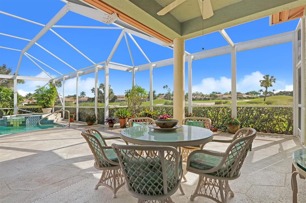Incredible south-facing golf course views from this magnificent 3BR/4BA+Den+Loft. Located in a cul-de-sac and overlooking the first and ninth holes of the Heritage Course, this home is filled with incredible light. An over-sized cul-de-sac lot provides a feeling of spaciousness as well as a lushly landscaped side yard (perfect for the gardener or pet owner.) The large fully screened enclosure houses a large pool and spa with plenty of covered area for entertaining. The owners have made the floor plan even more open by removing walls. The flooring has been replaced with an upgraded and elegant tile. Other upgrades include: custom office built-in, granite counters, pull-outs, master closet built-in, hurricane protective film on all the windows, replaced glass front doors, elegant wood...