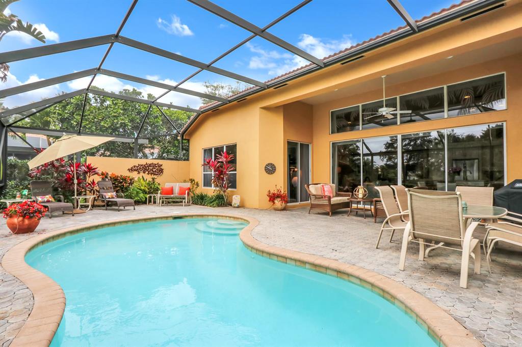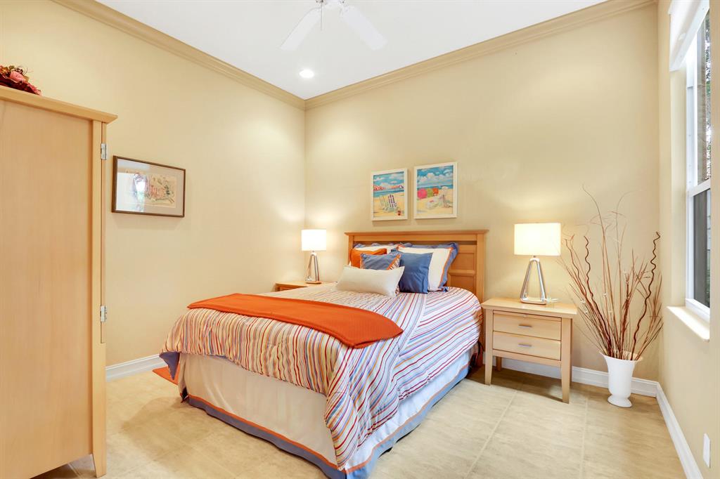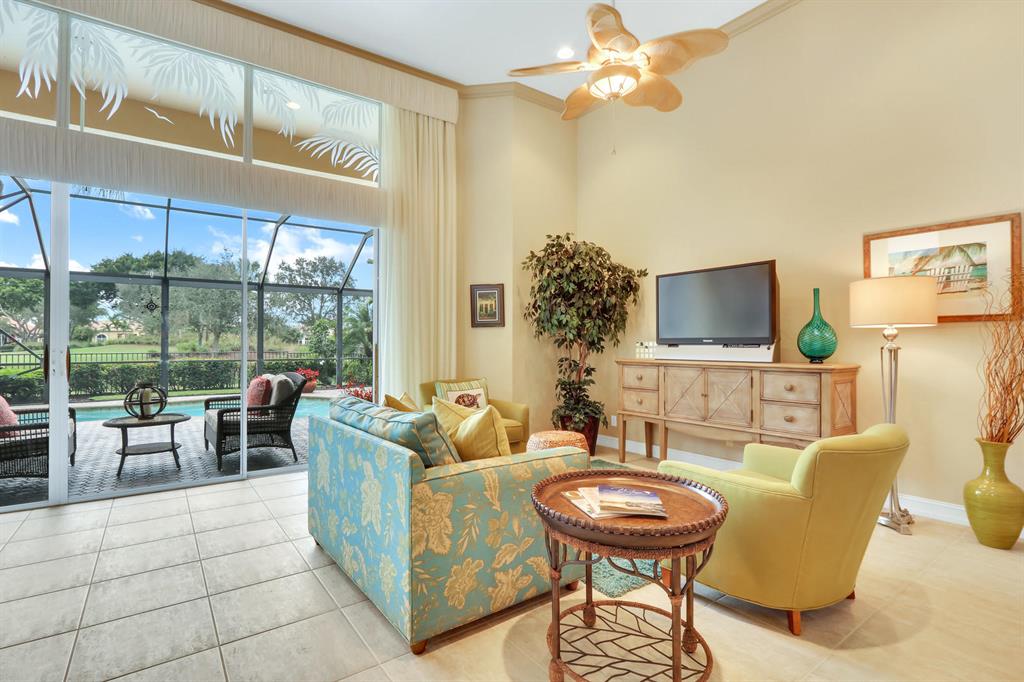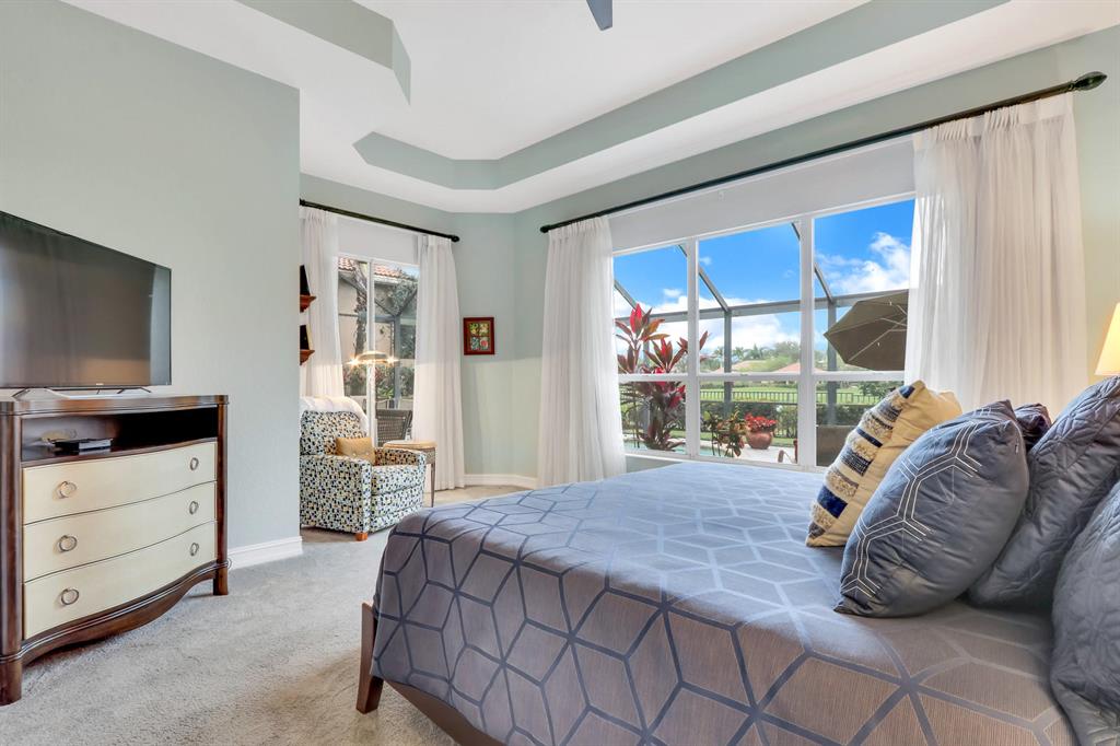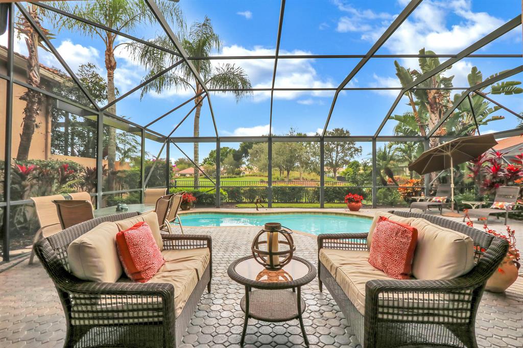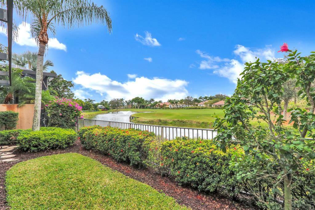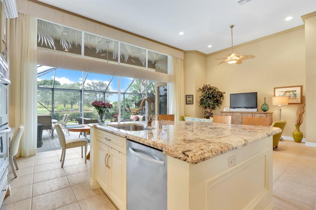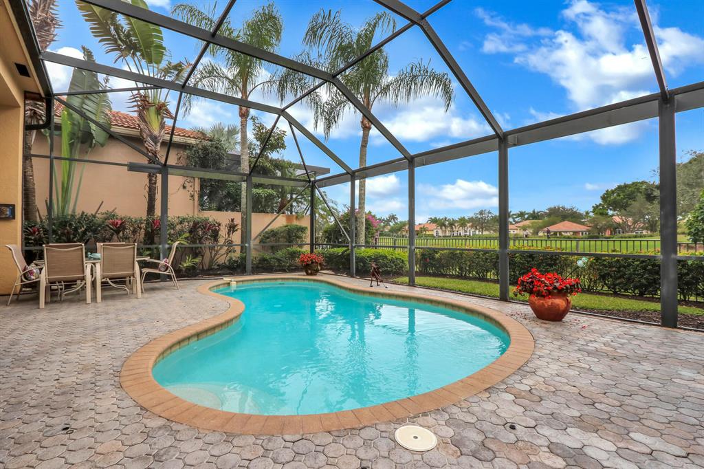Walk to the club, pool and fitness center from this sought after Ibis neighborhood. 2BR/3BADen home with a convertible bedroom that overlooks the 17 th green of Tradition with water and golf views. With a sought after SW exposure in back, this home has a fully screened back yard with a lovely pool including a new pool pump. The kitchen has been totally redone in white wood cabinets , with double ovens, gas stove, freezer on bottom of fridge, a large counter with stools, and a spacious desk area. Done in soft grey neutrals, the master has new carpet and a redone bath. Closet built ins and an oversized master with a sitting area that overlooks the pool and patio area. Ac is 4 yrs old Golf cart garage with extra storage inside garage. Crown molding + many extras!