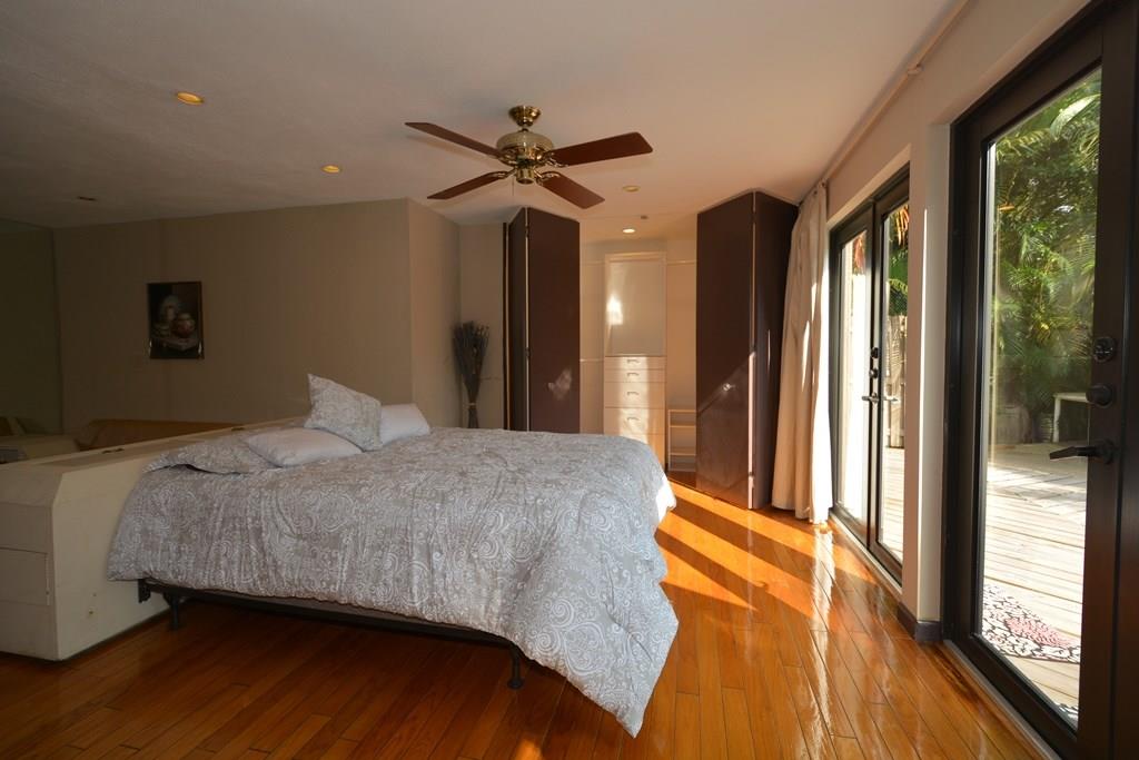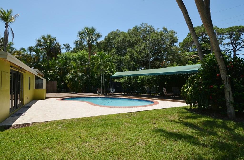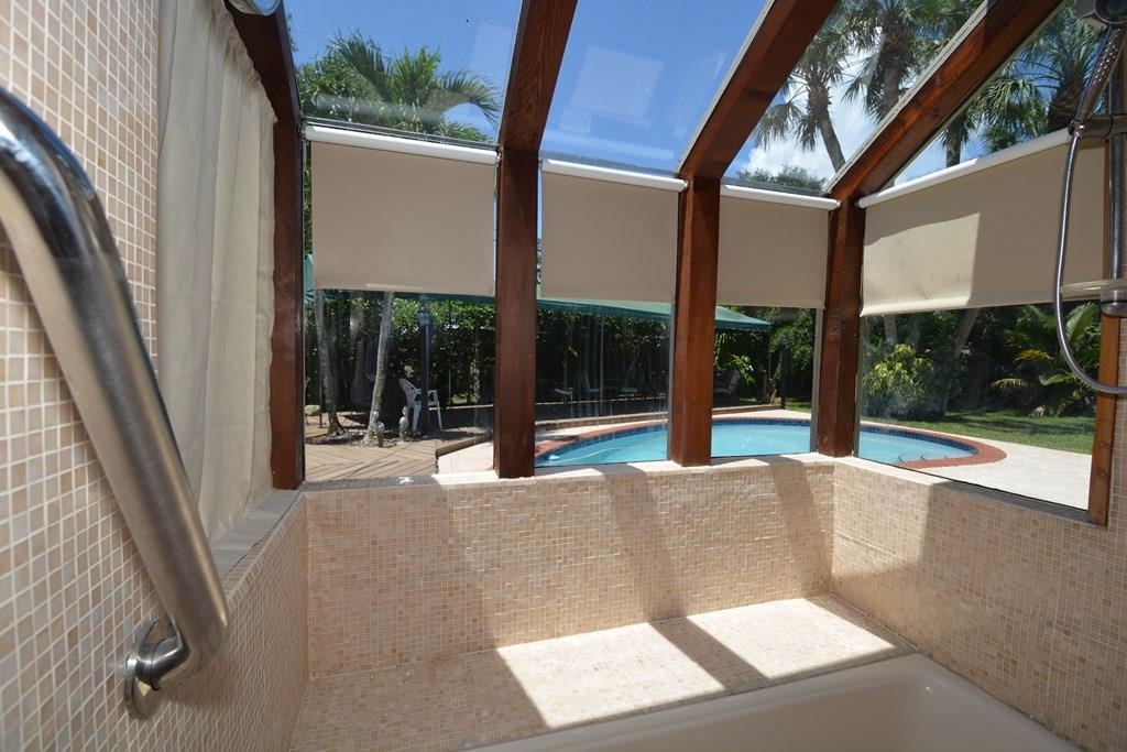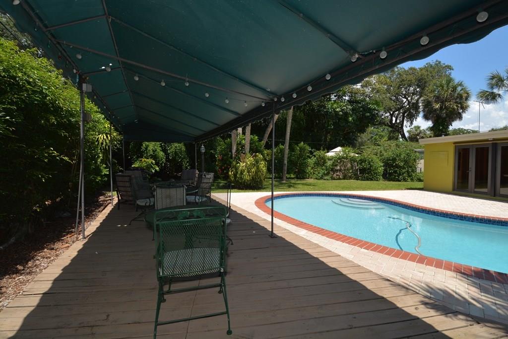 Red Hot Shady Banks! 2 spacious beds and 2.5 baths. Large den w/ .5 bath easily makes 3rd BR. Master w/ his & hers closets, garden shower, sink & water closet; view of private hot tub, swimming pool & yard thru double impact French doors. Built in fish tank, custom storage cabinets. Newer roof, window dressings, & sub zero fridge. Wood burning pass thru fireplace. Refinished wood & terrazzo floors. PGT impact windows, doors & skylights. Automatic gate, turtle pond, covered deck & lush tropical grounds.