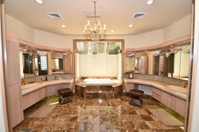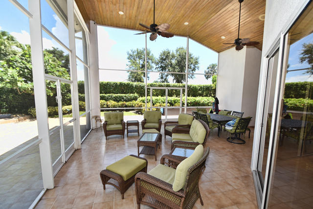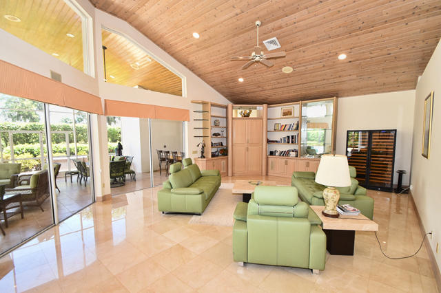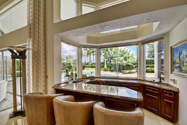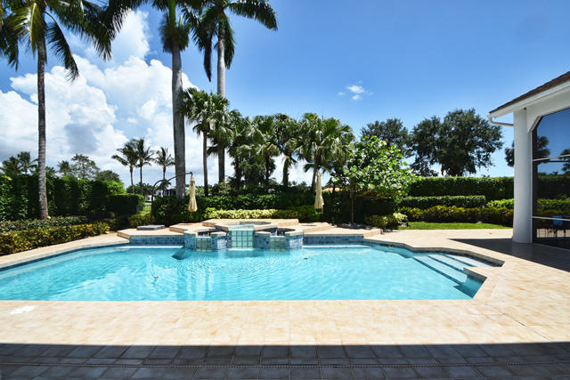 Beautiful Contemporary 5-bedroom + office one-story home on oversized lot with double fairway views. Newly painted inside & out, 2 new A/Cs, newly polished marble floors, new pool heater & pump, full-house video camera security, all LED lighting. Light & bright great room includes living room area complete with fireplace & wet bar plus a large dining room area. The kitchen, with Downsview cabinets, Viking gas cooktop & ovens, Sub-Zero refrigerator, Miele built-in coffee system, opens to family room. Master suite with dark wood floors & plantation shutters. Two of 4 guest bedrooms are ensuite & 1 has own entrance. Outside, lanai with outdoor kitchen has built-in BBQ & new dishwasher. Heated pool, tiled patio, full cabana bath with steam shower. Circular drive, 3-car garage, marble entryway.