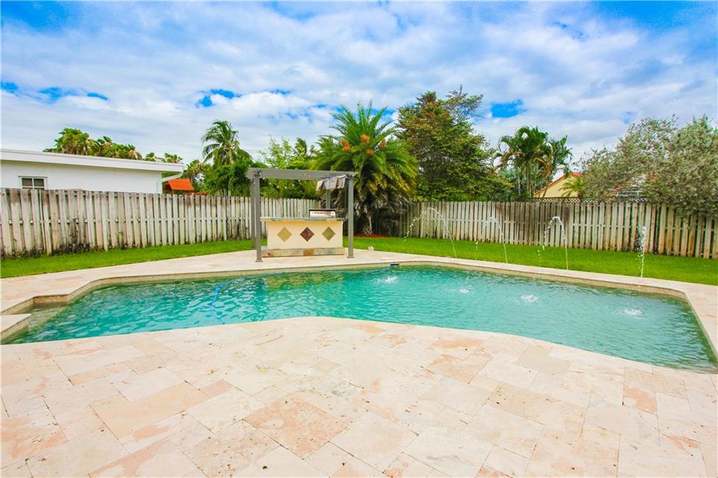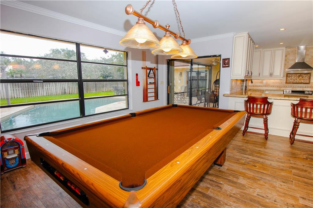 Look No Further, The Hunt is Over! Everything you ever wanted in a home. Updated wood tile floors throughout. Gorgeous gourmet custom glazed wood kitchen with granite counter tops and stainless steel appliances. Wet bar. Huge yard with over-sized travertine marble pool deck. Outdoor kitchen. Updated pool with pebble tech finish & water jets. Remodeled master bath. Cedar wood ceilings in dining & living areas. New front & garage doors. Hurricane accordian shutters. Custom built closets. New Roof.