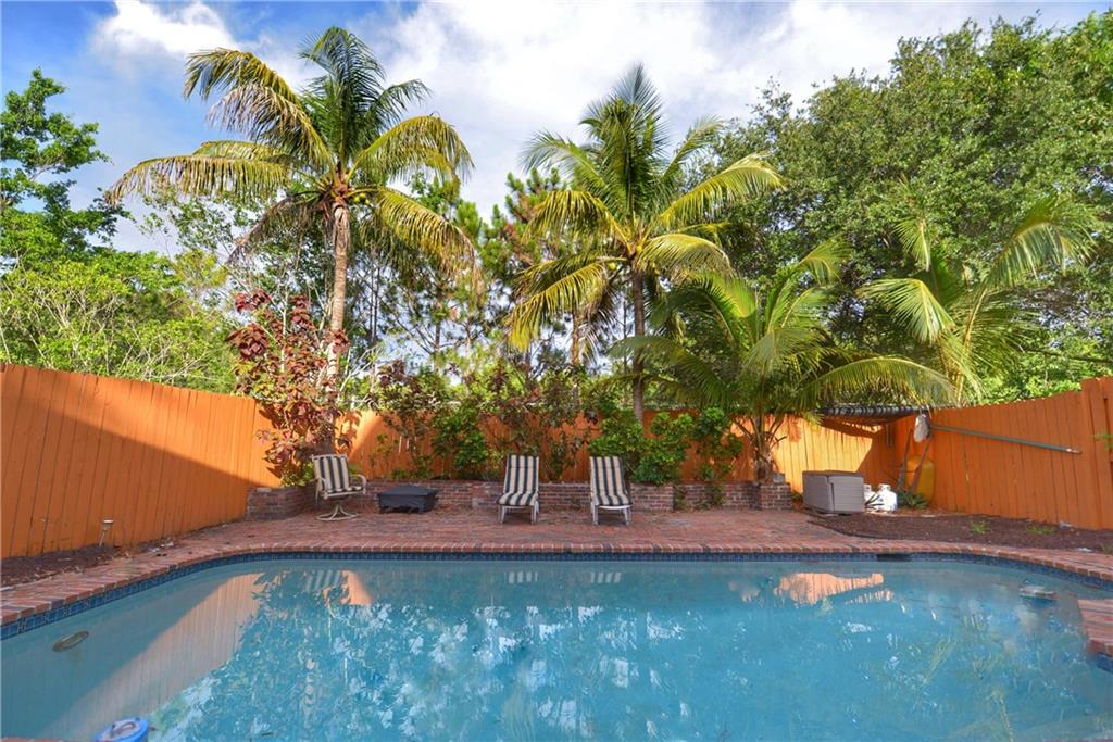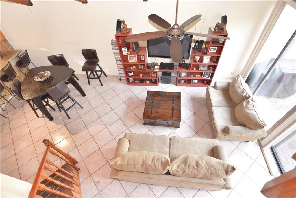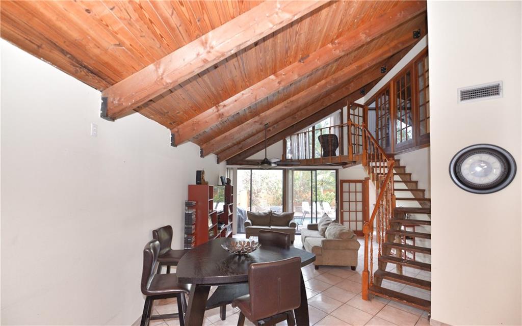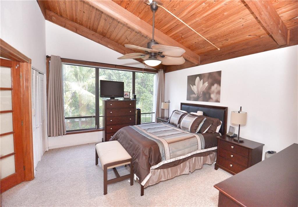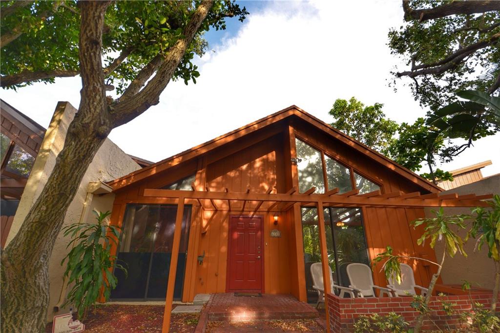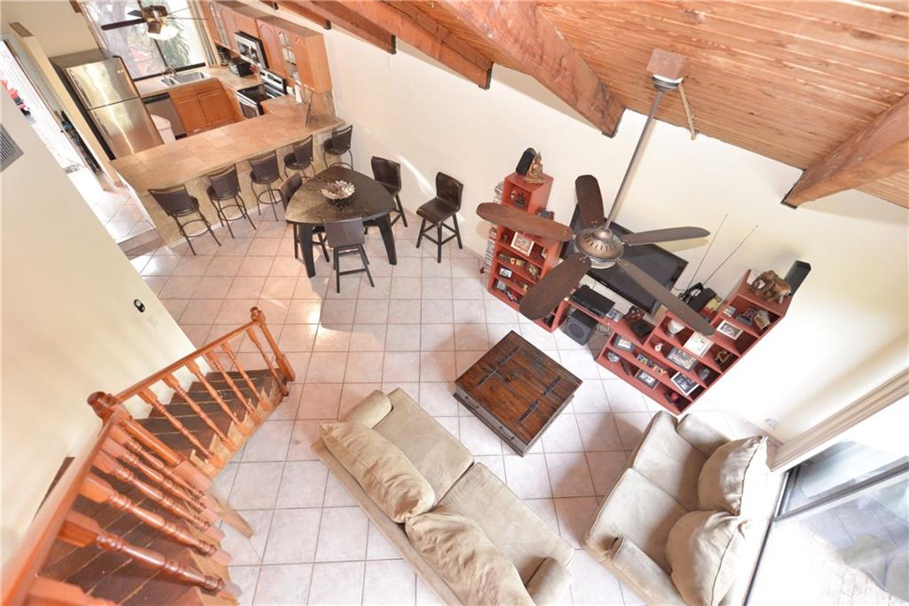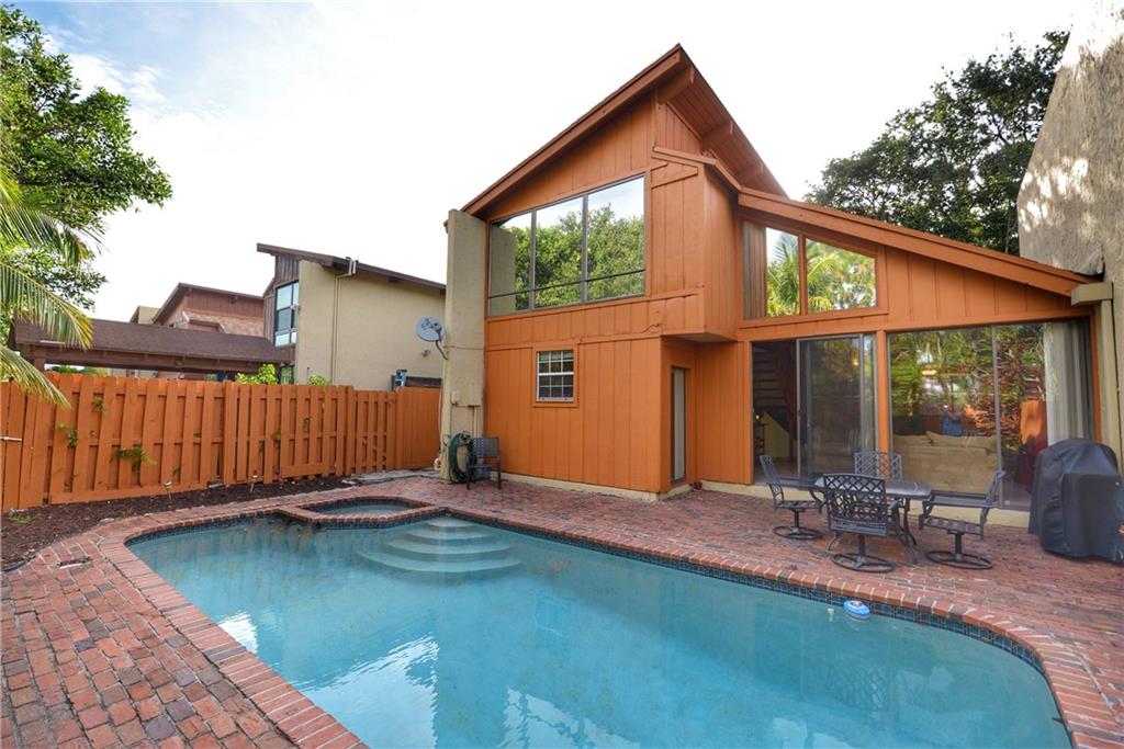 Beautifully updated townhome. Soaring 18 ft wood beam ceilings with walls of glass allowing natural light and nature inside. Kitchen and 2 baths updated. Private brick patio with owners private pool. Living spaces flows into the pool area and tropical setting. Master bath with jacuzzi and bonus loft area office. Club house with heated pool,tennis and racquet ball. Downstairs washer and dryer. Pets welcome. 2 parking spaces in front. HOA fee $65 mo. Wont last. Unique property.
